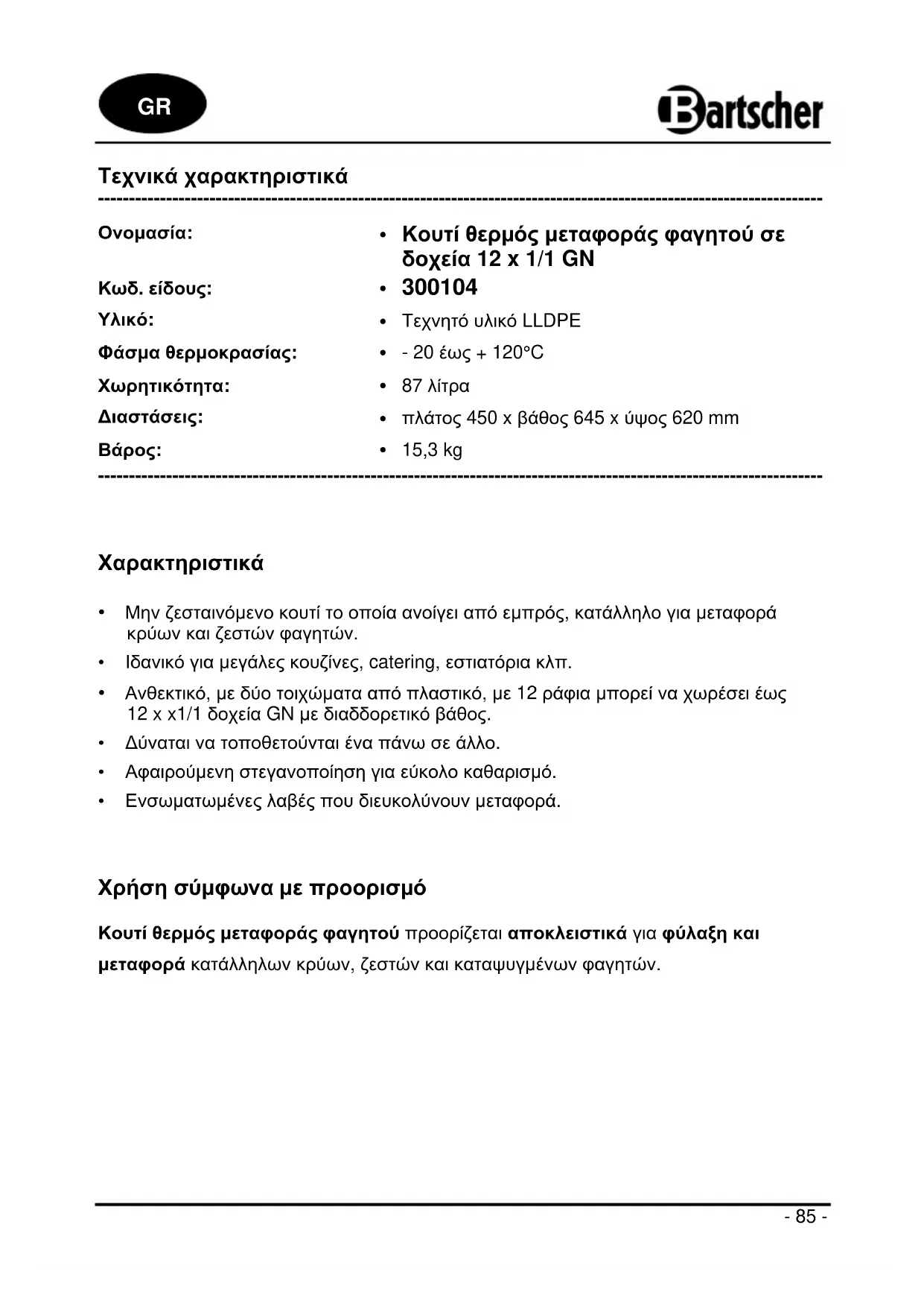 Χρήση σύµφωνα µε προορισµό Κουτί θερµός µεταφοράς φαγητού προορίζεται αποκλειστικά για φύλαξη και µεταφορά κατάλληλων κρύων, ζεστών και καταψυγµένων φαγητών. GR- 86 - Κατάλογος συστηµάτων και εξαρτηµάτων