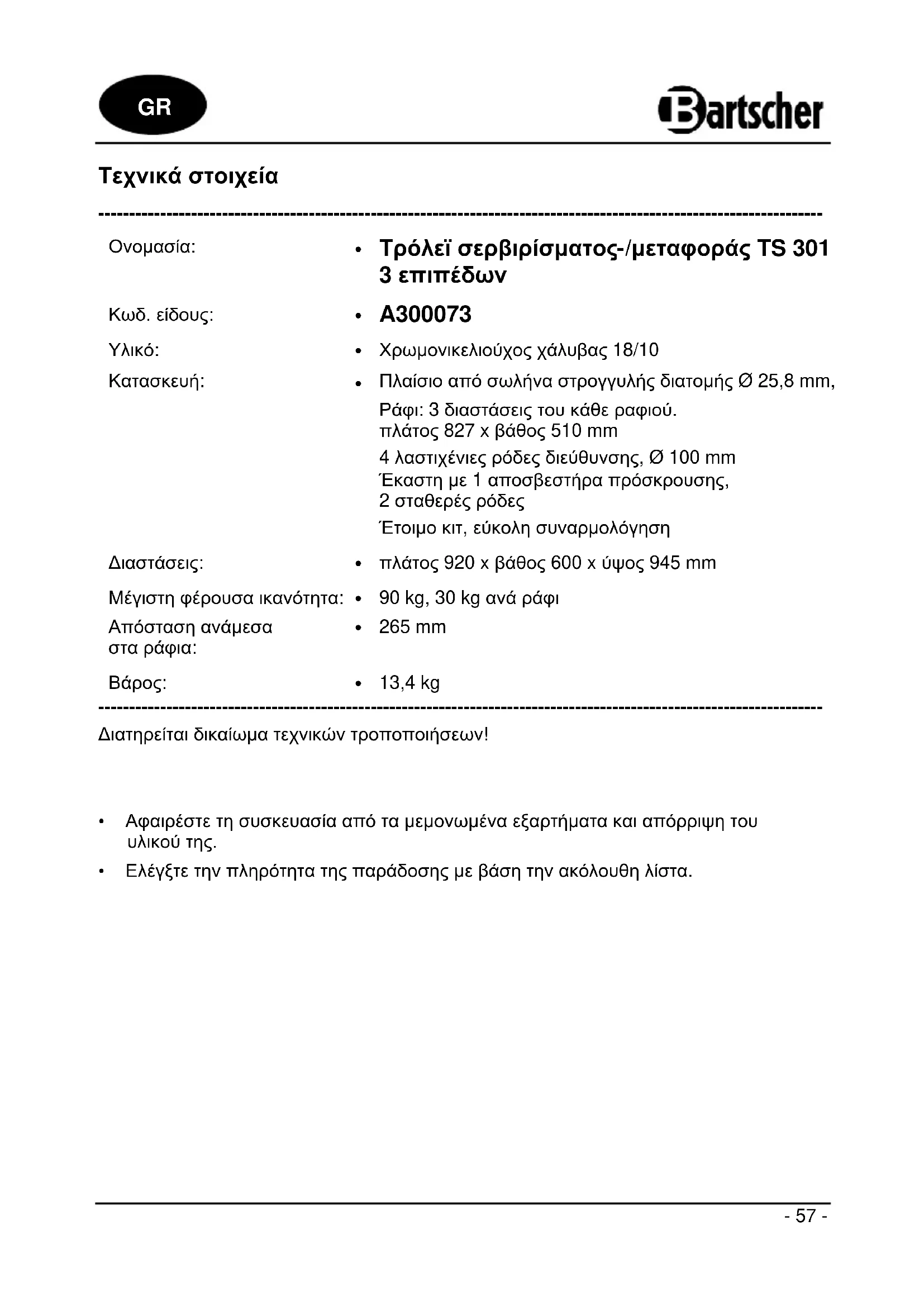 TS301 - Καρότσι μεταφοράς BARTSCHER - Δωρεάν εγχειρίδιο χρήσης
