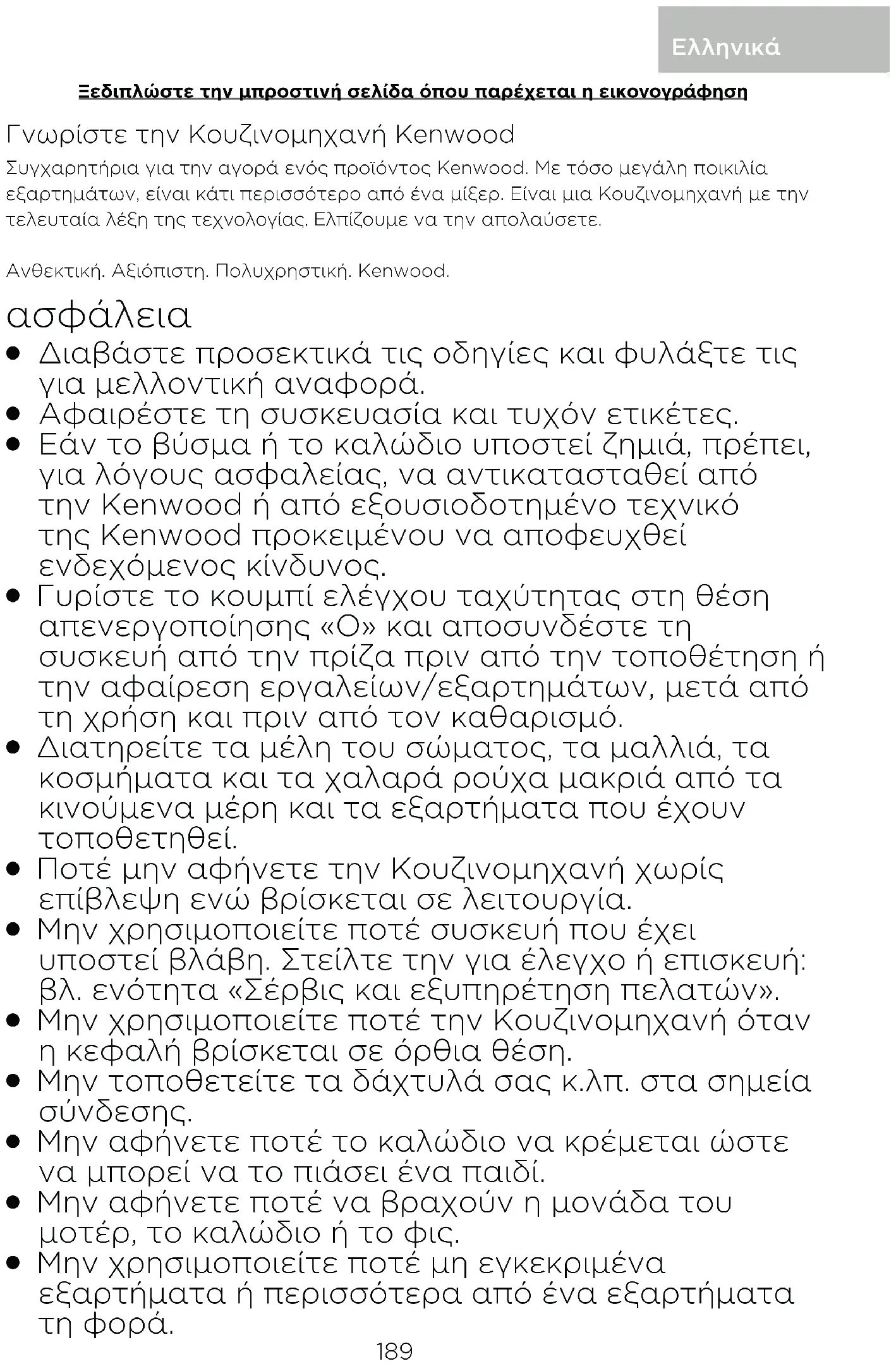 Εάν το βύσμα ή το καλώδιο υποστεί ζημιά, πρέπει, για λόγους ασφαλείας, να αντικατασταθεί από την Kenwood ή από εξουσιοδοτημένο τεχνικό της Kenwood προκειμένου να αποφευχθεί ενδεχόμενος κίνδυνος.