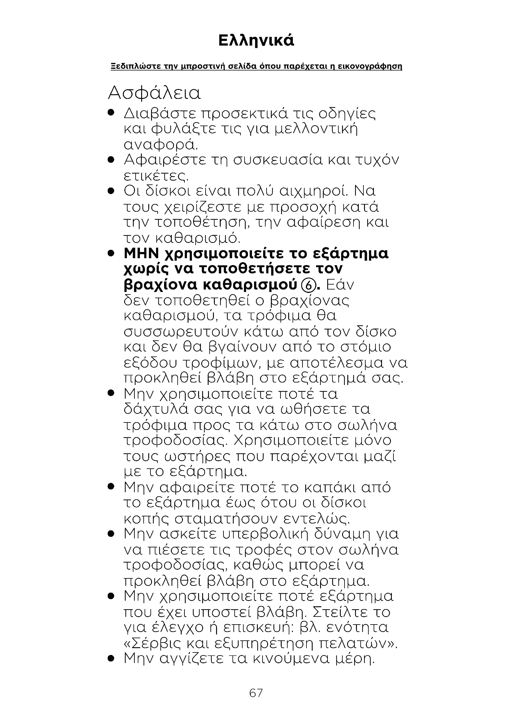 Μην χρησιμοποιείτε ποτέ τα δάχτυλά σας για να ωθήσετε τα τρόφιμα προς τα κάτω στο σωλήνα τροφοδοσίας. Χρησιμοποιείτε μόνο τους ωστήρες που παρέχονται μαζί με το εξάρτημα.