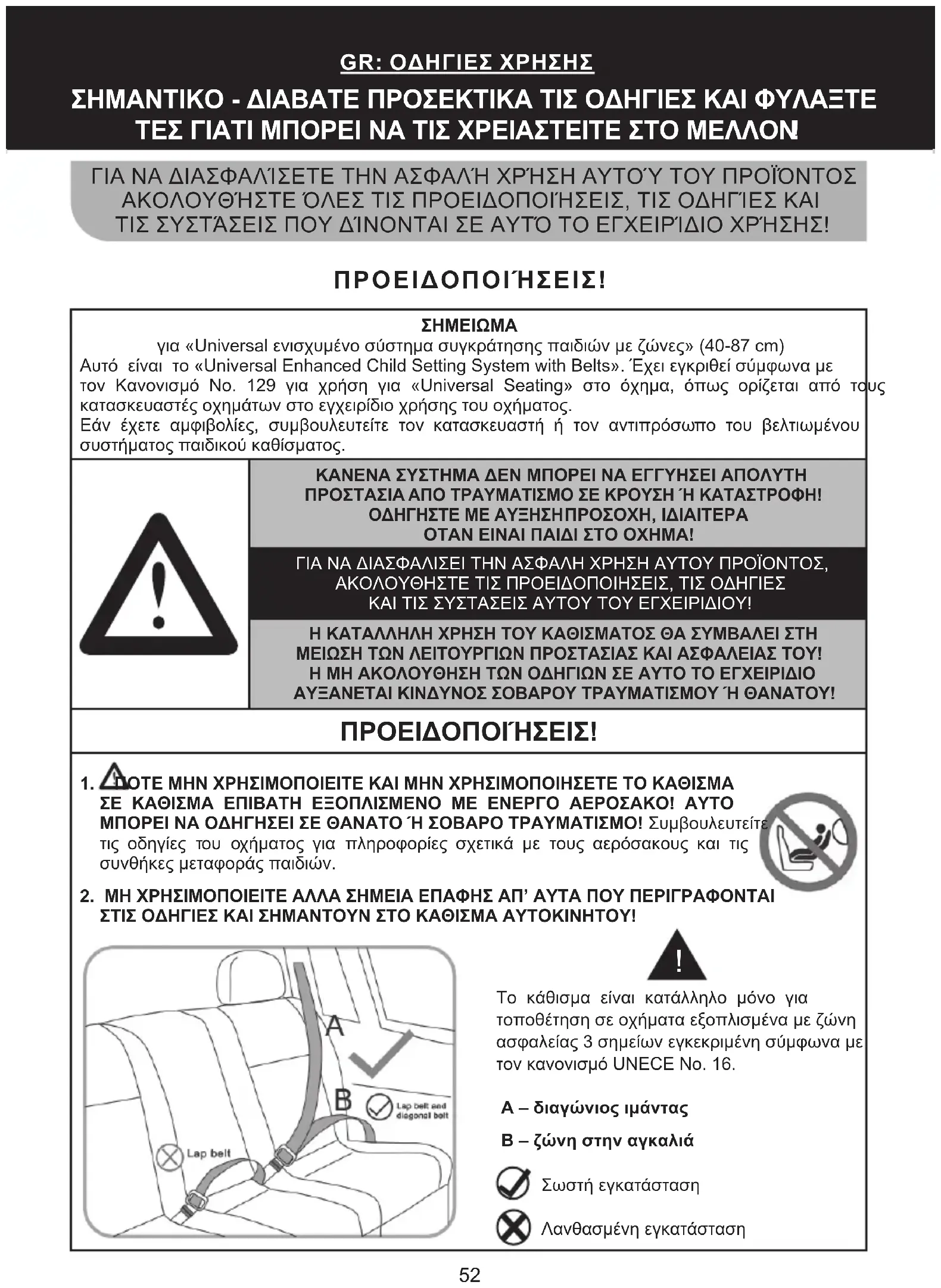 ΣΗΜΕΙΩΜΑγια «Universal ενισχυμένο σύστημα συγκράτησης παιδιών με ζώνες» (40-87 cm)Αυτό είναι το «Universal Enhanced Child Setting System with Belts». Έχει εγκριθεί σύμφωνα με τον Κανονισμό Νο. 129 για χρήση για «Universal Seating» στο όχημα, όπως ορίζεται από τους κατασκευαστές οχημάτων στο εγχειρίδιο χρήσης του οχήματος. Εάν έχετε αμφιβολίες, συμβουλευτείτε τον κατασκευαστή ή τον αντιπρόσωπο του βελτιωμένου συστήματος παιδικού καθίσματος.ΚΑΝΕΝΑ ΣΥΣΤΗΜΑ ΔΕΝ ΜΠΟΡΕΙ ΝΑ ΕΓΓΥΗΣΕΙ ΑΠΟΛΥΤΗ ΠΡΟΣΤΑΣΙΑ ΑΠΟ ΤΡΑΥΜΑΤΙΣΜΟ ΣΕ ΚΡΟΥΣΗ Ή ΚΑΤΑΣΤΡΟΦΗ! ΟΔΗΓΗΣΤΕ ΜΕ ΑΥΞΗΣΗ ΠΡΟΣΟΧΗ, ΙΔΙΑΙΤΕΡΑ ΟΤΑΝ ΕΙΝΑΙ ΠΑΙΔΙ ΣΤΟ ΟΧΗΜΑ!ΓΙΑ ΝΑ ΔΙΑΣΦΑΛΙΣΕΙ ΤΗΝ ΑΣΦΑΛΗ ΧΡΗΣΗ ΑΥΤΟΥ ΠΡΟΪΟΝΤΟΣ, ΑΚΟΛΟΥΘΗΣΤΕ ΤΙΣ ΠΡΟΕΙΔΟΠΟΙΗΣΕΙΣ, ΤΙΣ ΟΔΗΓΙΕΣ ΚΑΙ ΤΙΣ ΣΥΣΤΑΣΕΙΣ ΑΥΤΟΥ ΤΟΥ ΕΓΧΕΙΡΙΔΙΟΥ!Η ΚΑΤΑΛΛΗΛΗ ΧΡΗΣΗ ΤΟΥ ΚΑΘΙΣΜΑΤΟΣ ΘΑ ΣΥΜΒΑΛΕΙ ΣΤΗ ΜΕΙΩΣΗ ΤΩΝ ΛΕΙΤΟΥΡΓΙΩΝ ΠΡΟΣΤΑΣΙΑΣ ΚΑΙ ΑΣΦΑΛΕΙΑΣ ΤΟΥ!Η ΜΗ ΑΚΟΛΟΥΘΗΣΗ ΤΩΝ ΟΔΗΓΙΩΝ ΣΕ ΑΥΤΟ ΤΟ ΕΓΧΕΙΡΙΔΙΟ ΑΥΞΑΝΕΤΑΙ ΚΙΝΔΥΝΟΣ ΣΟΒΑΡΟΥ ΤΡΑΥΜΑΤΙΣΜΟΥ Ή ΘΑΝΑΤΟΥ! ΠΡΟΕΙΔΟΠΟΙΉΣΕΙΣ! 1. ΠΟΤΕ ΜΗΝ ΧΡΗΣΙΜΟΠΟΙΕΙΤΕ ΚΑΙ ΜΗΝ ΧΡΗΣΙΜΟΠΟΙΗΣΕΤΕ ΤΟ ΚΑΘΙΣΜΑ ΣΕ ΚΑΘΙΣΜΑ ΕΠΙΒΑΤΗ ΕΞΟΠΛΙΣΜΕΝΟ ΜΕ ΕΝΕΡΓΟ ΑΕΡΟΣΑΚΟ! ΑΥΤΟ ΜΠΟΡΕΙ ΝΑ ΟΔΗΓΗΣΕΙ ΣΕ ΘΑΝΑΤΟ Ή ΣΟΒΑΡΟ ΤΡΑΥΜΑΤΙΣΜΟ! Συμβουλευτείτε τις οδηγίες του οχήματος για πληροφορίες σχετικά με τους αερόσακους και τις συνθήκες μεταφοράς παιδιών.2. ΜΗ ΧΡΗΣΙΜΟΠΟΙΕΙΤΕ ΑΛΛΑ ΣΗΜΕΙΑ ΕΠΑΦΗΣ ΑΠ’ ΑΥΤΑ ΠΟΥ ΠΕΡΙΓΡΑΦΟΝΤΑΙ ΣΤΙΣ ΟΔΗΓΙΕΣ ΚΑΙ ΣΗΜΑΝΤΟΥΝ ΣΤΟ ΚΑΘΙΣΜΑ ΑΥΤΟΚΙΝΗΤΟΥ! Το κάθισμα είναι κατάλληλο μόνο για τοποθέτηση σε οχήματα εξοπλισμένα με ζώνη ασφαλείας 3 σημείων εγκεκριμένη σύμφωνα με τον κανονισμό UNECE Νο. 16. A – διαγώνιος ιμάντας B – ζώνη στην αγκαλιά Σωστή εγκατάσταση Λανθασμένη εγκατάσταση 52ΘΕΣΕΙΣ ΣΤΟ ΟΧΗΜΑ Δεν επιτρέπεται η τοποθέτηση του καθίσματος Επιτρέπεται η τοποθέτηση του καθίσματος