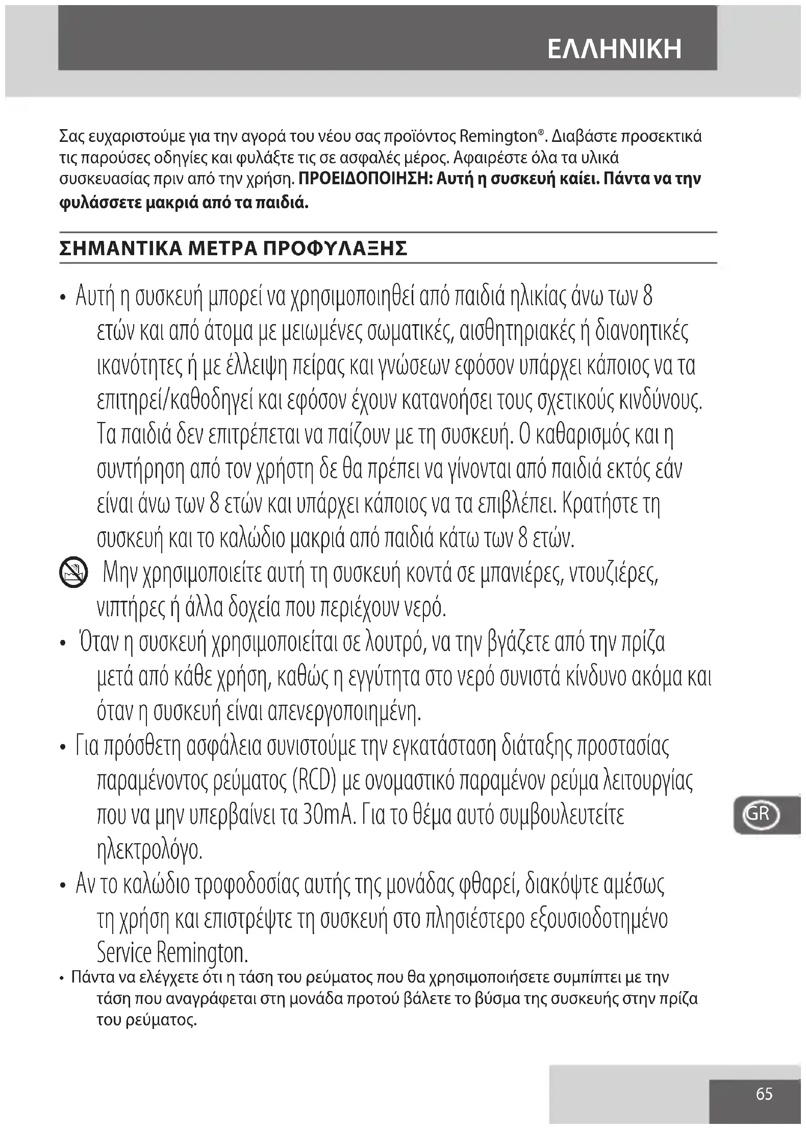 - Αν το καλώδιο τροφοδοσίας αυτής της μονάδας φθαρεί, διακόψτε αμέσως τη χρήση και επιστρέψτε τη συσκευή στο πλησιέστερο εξουσιοδοτημένο Service Remington.