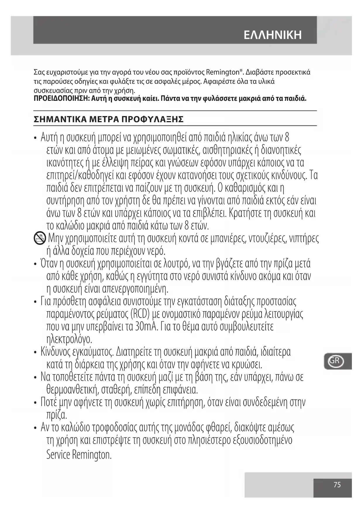 - Αν το καλώδιο τροφοδοσίας αυτής της μονάδας φθαρεί, διακόψτε αμέσως τη χρήση και επιστρέψτε τη συσκευή στο πλησιέστερο εξουσιοδοτημένο Service Remington.