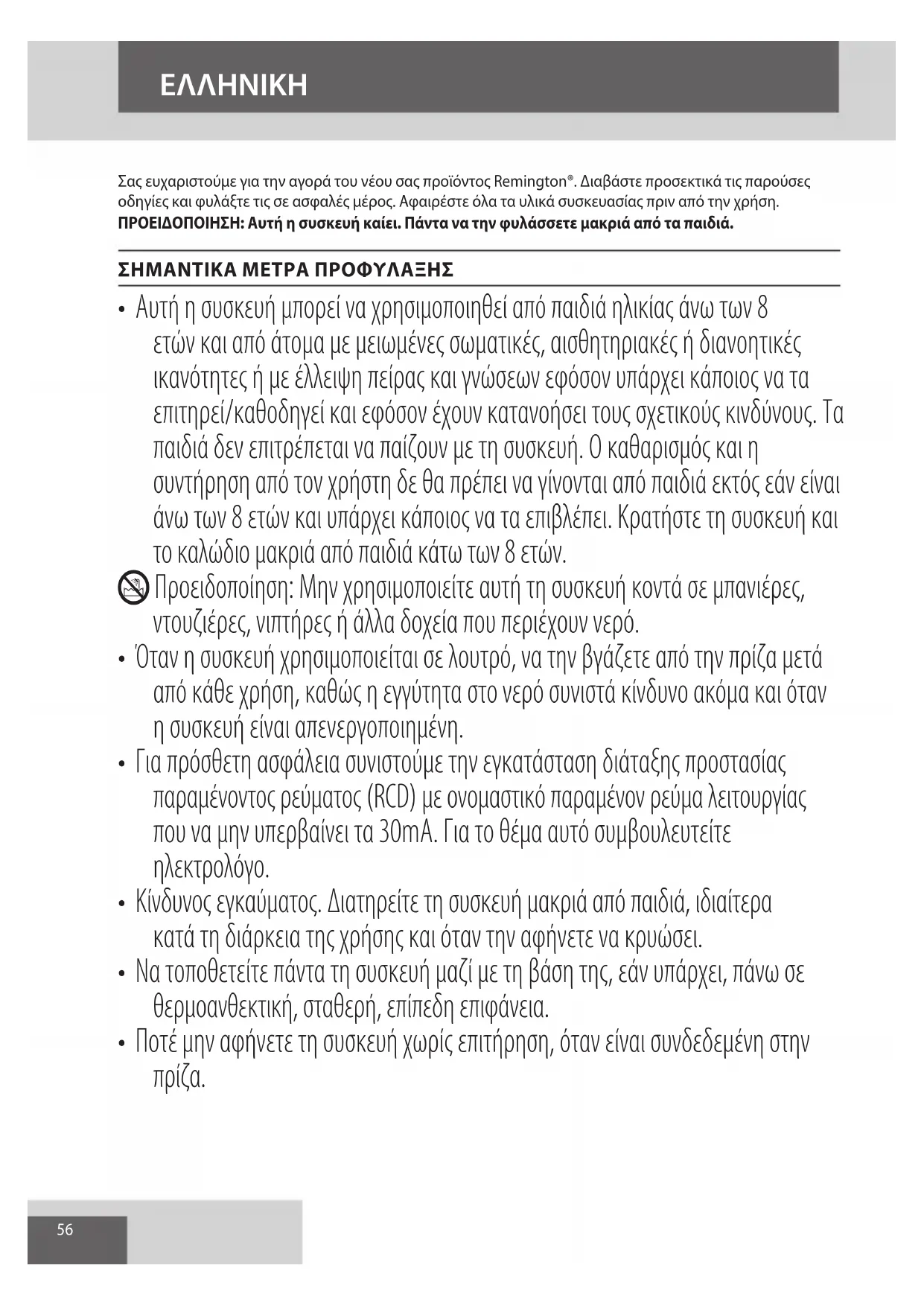 AE56 Σας ευχαριστούμε για την αγορά του νέου σας προϊόντος Remington®. Διαβάστε προσεκτικά τις παρούσες οδηγίες και φυλάξτε τις σε ασφαλές μέρος. Αφαιρέστε όλα τα υλικά συσκευασίας πριν από την χρήση. ΠΡΟΕΙΔΟΠΟΙΗΣΗ: Αυτή η συσκευή καίει. Πάντα να την φυλάσσετε μακριά από τα παιδιά. ΣΗΜΑΝΤΙΚΑ ΜΕΤΡΑ ΠΡΟΦΥΛΑΞΗΣ