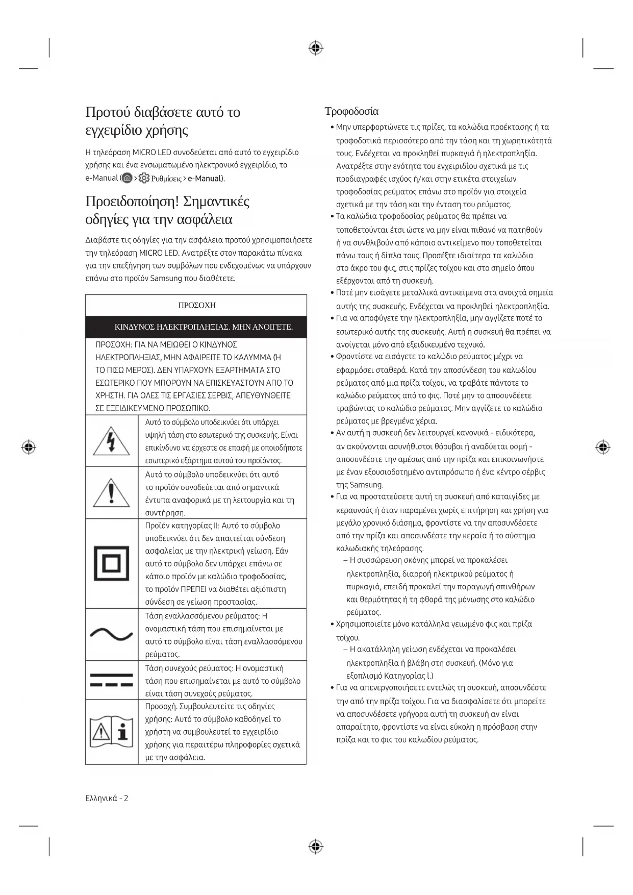 - Z uwagi na bezpieczeństwo nie należy próbować wyjmować baterii samodzielnie. Wyjęcie baterii w nieprawidłowy sposób może doprowadzić do uszkodzenia baterii i urządzenia, skutkować obrażeniami i/lub spowodować, że korzystanie z urządzenia nie będzie bezpieczne. Polski - 11 PolskiΠροτού διαβάσετε αυτό το εγχειρίδιο χρήσης Η τηλεόραση MICRO LED συνοδεύεται από αυτό το εγχειρίδιο χρήσης και ένα ενσωματωμένο ηλεκτρονικό εγχειρίδιο, το e-Manual ( > Ρυθμίσεις > e-Manual). Προειδοποίηση! Σημαντικές οδηγίες για την ασφάλεια Διαβάστε τις οδηγίες για την ασφάλεια προτού χρησιμοποιήσετε την τηλεόραση MICRO LED. Ανατρέξτε στον παρακάτω πίνακα για την επεξήγηση των συμβόλων που ενδεχομένως να υπάρχουν επάνω στο προϊόν Samsung που διαθέτετε.