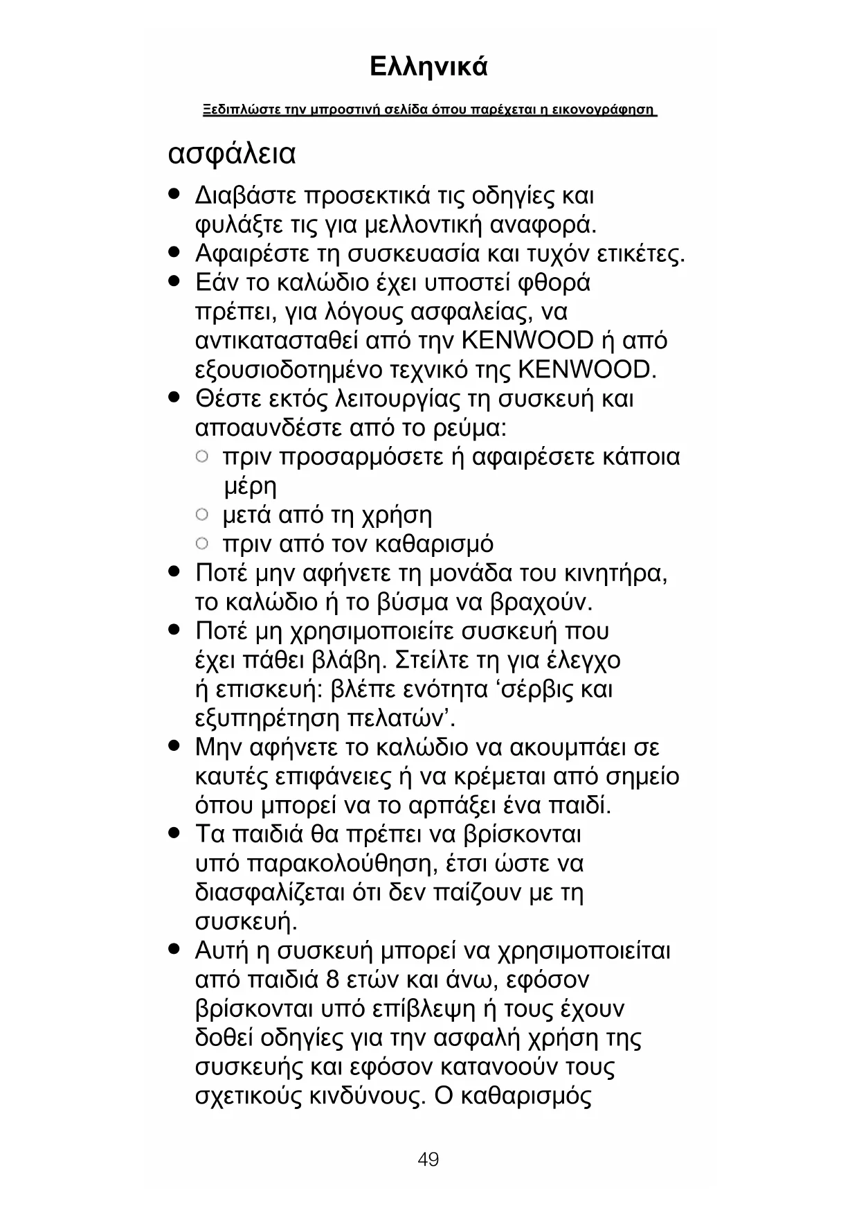 Αυτή η συσκευή μπορεί να χρησιμοποιείται από παιδιά 8 ετών και άνω, εφόσον βρίσκονται υπό επίβλεψη ή τους έχουν δοθεί οδηγίες για την ασφαλή χρήση της συσκευής και εφόσον κατανοούν τους σχετικούς κινδύνους. Ο καθαρισμός Ξεδιπλώστε την μπροστινή σελίδα όπου παρέχεται η εικονογράφηση Ekkgmij50 και η συντήρηση χρήστη δεν πρέπει να πραγματοποιούνται από παιδιά, εκτός εάν είναι 8 ετών και άνω και βρίσκονται υπό επίβλεψη. Φυλάσσετε τη συσκευή και το καλώδιό της μακριά από παιδιά κάτω των 8