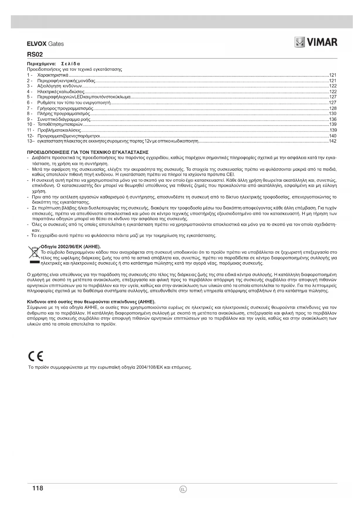- Το εγχειρίδιο αυτό πρέπει να φυλάσσεται πάντα μαζί με την τεκμηρίωση της εγκατάστασης. Οδηγία 2002/96/ΕΚ (ΑΗΗΕ). Το σύμβολο διαγραμμένου κάδου που αναγράφεται στη συσκευή υποδεικνύει ότι το προϊόν πρέπει να υποβάλλεται σε ξεχωριστή επεξεργασία στο τέλος της ωφέλιμης διάρκειας ζωής του από τα αστικά απόβλητα και, συνεπώς, πρέπει να παραδίδεται σε κέντρο διαφοροποιημένης συλλογής για ηλεκτρικές και ηλεκτρονικές συσκευές ή στο κατάστημα πώλησης κατά την αγορά νέας, παρόμοιας συσκευής. Ο χρήστης είναι υπεύθυνος για την παράδοση της συσκευής στο τέλος της διάρκειας ζωής της στα ειδικά κέντρα συλλογής. Η κατάλληλη διαφοροποιημένη συλλογή με σκοπό τη μετέπειτα ανακύκλωση, επεξεργασία και φιλική προς το περιβάλλον απόρριψη της συσκευής συμβάλλει στην αποφυγή πιθανών αρνητικών επιπτώσεων για το περιβάλλον και την υγεία, καθώς και στην ανακύκλωση των υλικών από τα οποία αποτελείται το προϊόν. Για πιο λεπτομερείς πληροφορίες σχετικά με τα διαθέσιμα συστήματα συλλογής, απευθυνθείτε στην τοπική υπηρεσία απόρριψης αποβλήτων ή στο κατάστημα πώλησης. Κίνδυνοι από ουσίες που θεωρούνται επικίνδυνες (ΑΗΗΕ). Σύμφωνα με τη νέα οδηγία ΑΗΗΕ, οι ουσίες που χρησιμοποιούνται ευρέως σε ηλεκτρικές και ηλεκτρονικές συσκευές θεωρούνται επικίνδυνες για τον άνθρωπο και το περιβάλλον. Η κατάλληλη διαφοροποιημένη συλλογή με σκοπό τη μετέπειτα ανακύκλωση, επεξεργασία και φιλική προς το περιβάλλον απόρριψη της συσκευής συμβάλλει στην αποφυγή πιθανών αρνητικών επιπτώσεων για το περιβάλλον και την υγεία, καθώς και στην ανακύκλωση των υλικών από τα οποία αποτελείται το προϊόν. Το προϊόν συμμορφώνεται με την ευρωπαϊκή οδηγία 2004/108/ΕΚ και επόμενες. EL119 RS02