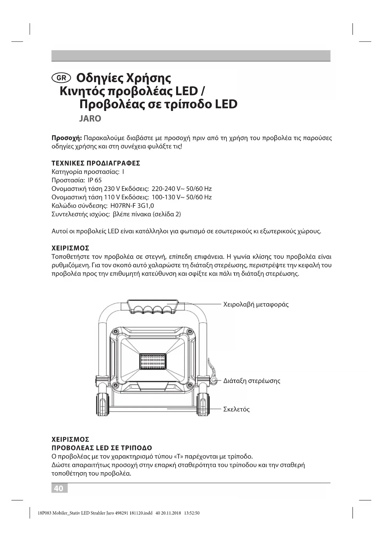 ΠΡΟΒΟΛΕΑΣ LED ΣΕ ΤΡΙΠΟΔΟ Ο προβολέας με τον χαρακτηρισμό τύπου «T» παρέχονται με τρίποδο. Δώστε απαραιτήτως προσοχή στην επαρκή σταθερότητα του τρίποδου και την σταθερή τοποθέτηση του προβολέα. 18P083 Mobiler_Stativ LED Strahler Jaro 498291 181120.indd 40 20.11.2018 13:52:5041 JARO Οδηγίες Χρήσης