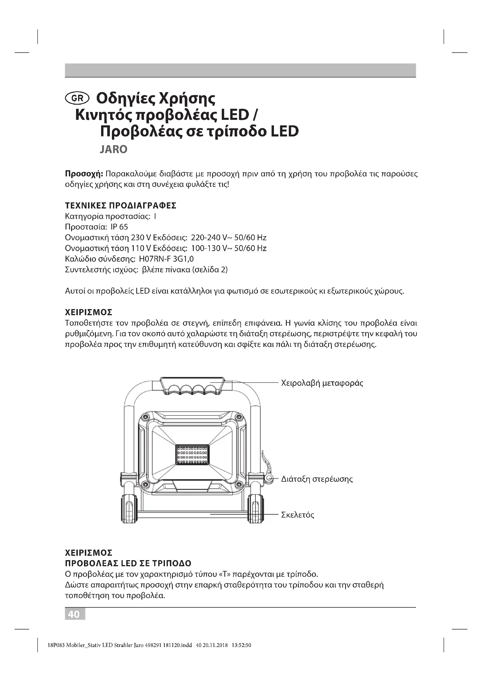 ΠΡΟΒΟΛΕΑΣ LED ΣΕ ΤΡΙΠΟΔΟ Ο προβολέας με τον χαρακτηρισμό τύπου «T» παρέχονται με τρίποδο. Δώστε απαραιτήτως προσοχή στην επαρκή σταθερότητα του τρίποδου και την σταθερή τοποθέτηση του προβολέα. 18P083 Mobiler_Stativ LED Strahler Jaro 498291 181120.indd 40 20.11.2018 13:52:5041 JARO Οδηγίες Χρήσης