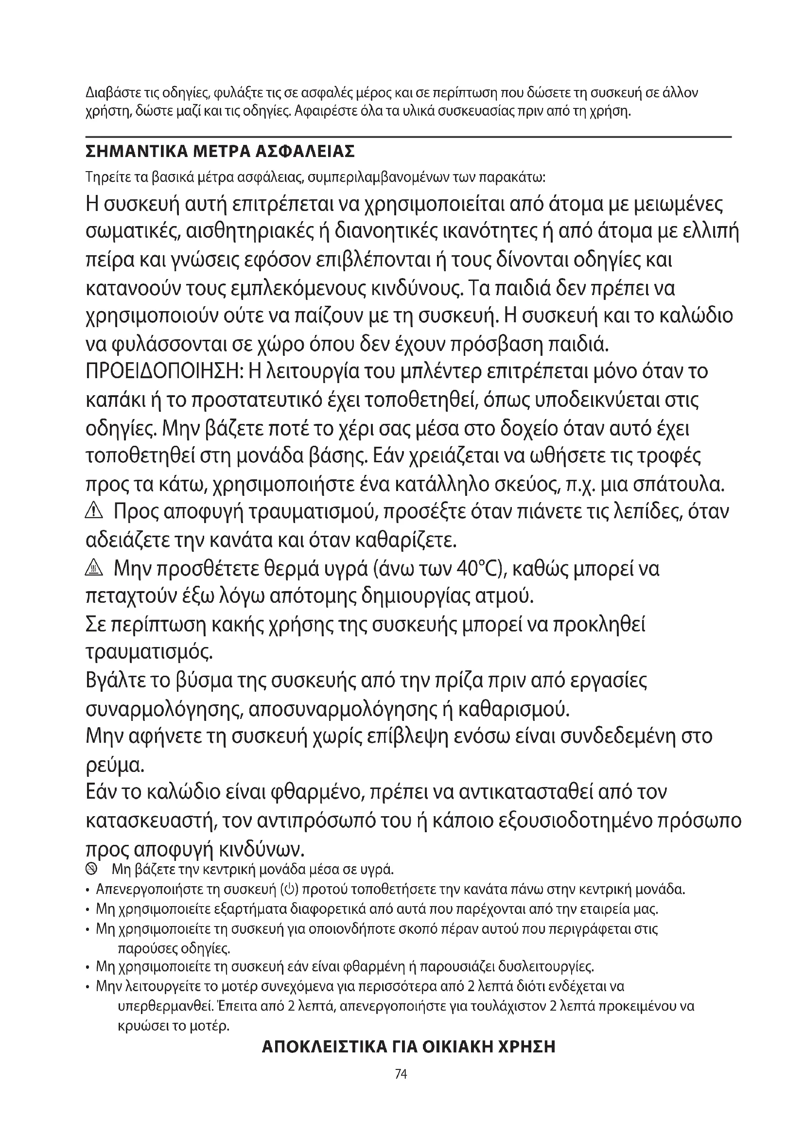 AE74 Διαβάστε τις οδηγίες, φυλάξτε τις σε ασφαλές μέρος και σε περίπτωση που δώσετε τη συσκευή σε άλλον χρήστη, δώστε μαζί και τις οδηγίες. Αφαιρέστε όλα τα υλικά συσκευασίας πριν από τη χρήση. ΣΗΜΑΝΤΙΚΑ ΜΕΤΡΑ ΑΣΦΑΛΕΙΑΣ Τηρείτε τα βασικά μέτρα ασφάλειας, συμπεριλαμβανομένων των παρακάτω: Η συσκευή αυτή επιτρέπεται να χρησιμοποιείται από άτομα με μειωμένες σωματικές, αισθητηριακές ή διανοητικές ικανότητες ή από άτομα με ελλιπή πείρα και γνώσεις εφόσον επιβλέπονται ή τους δίνονται οδηγίες και κατανοούν τους εμπλεκόμενους κινδύνους. Τα παιδιά δεν πρέπει να χρησιμοποιούν ούτε να παίζουν με τη συσκευή. Η συσκευή και το καλώδιο να φυλάσσονται σε χώρο όπου δεν έχουν πρόσβαση παιδιά. ΠΡΟΕΙΔΟΠΟΙΗΣΗ: Η λειτουργία του μπλέντερ επιτρέπεται μόνο όταν το καπάκι ή το προστατευτικό έχει τοποθετηθεί, όπως υποδεικνύεται στις οδηγίες. Μην βάζετε ποτέ το χέρι σας μέσα στο δοχείο όταν αυτό έχει τοποθετηθεί στη μονάδα βάσης. Εάν χρειάζεται να ωθήσετε τις τροφές προς τα κάτω, χρησιμοποιήστε ένα κατάλληλο σκεύος, π.χ. μια σπάτουλα. c Προς αποφυγή τραυματισμού, προσέξτε όταν πιάνετε τις λεπίδες, όταν αδειάζετε την κανάτα και όταν καθαρίζετε. h Μην προσθέτετε θερμά υγρά (άνω των 40°C), καθώς μπορεί να πεταχτούν έξω λόγω απότομης δημιουργίας ατμού. Σε περίπτωση κακής χρήσης της συσκευής μπορεί να προκληθεί τραυματισμός. Βγάλτε το βύσμα της συσκευής από την πρίζα πριν από εργασίες συναρμολόγησης, αποσυναρμολόγησης ή καθαρισμού. Μην αφήνετε τη συσκευή χωρίς επίβλεψη ενόσω είναι συνδεδεμένη στο