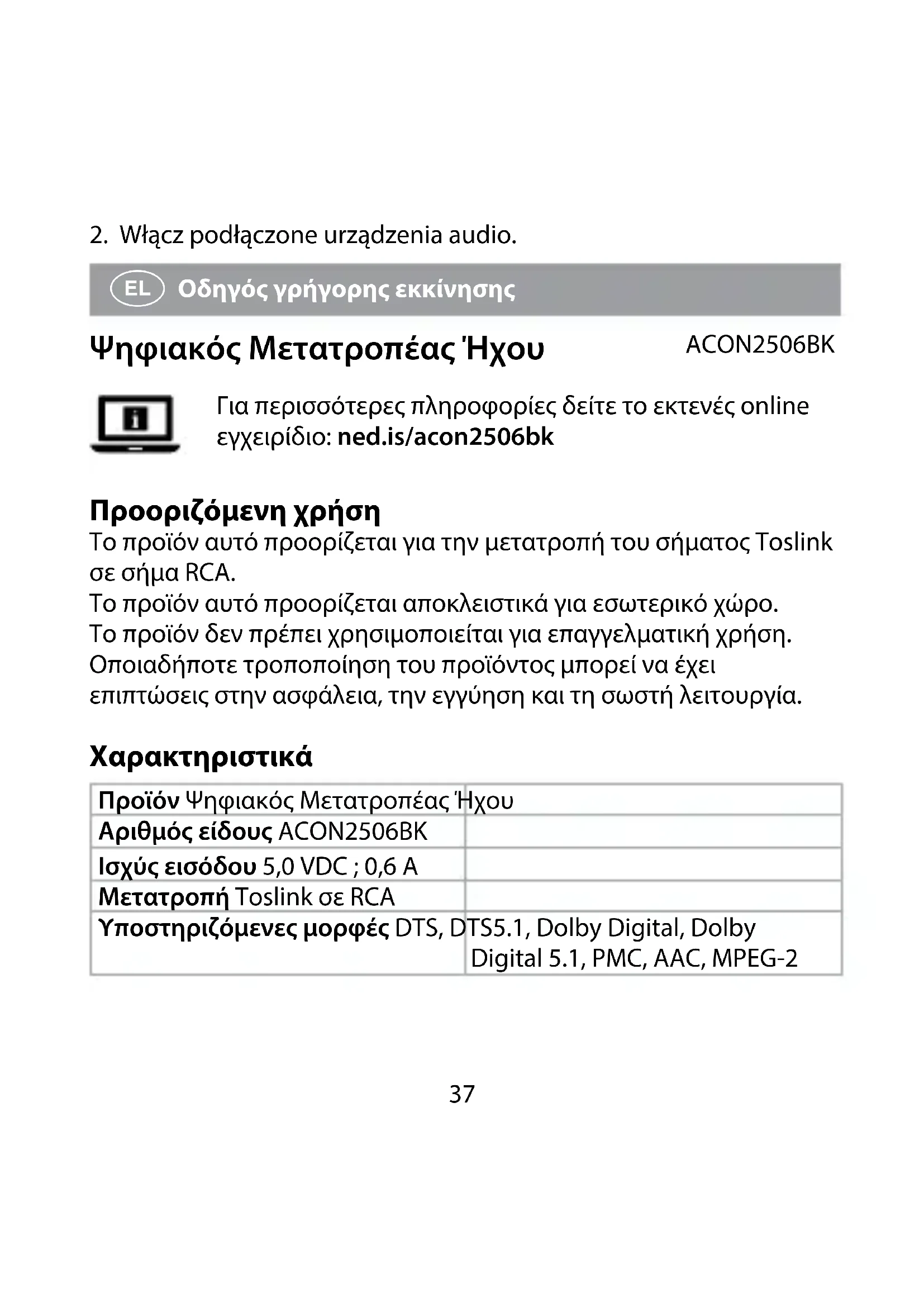 Οδηγός γρήγορης εκκίνησης Ψηφιακός Μετατροπέας Ήχου ACON2506BK Για περισσότερες πληροφορίες δείτε το εκτενές online εγχειρίδιο: ned.is/acon2506bk Προοριζόμενη χρήση Το προϊόν αυτό προορίζεται για την μετατροπή του σήματος Toslink σε σήμα RCA. Το προϊόν αυτό προορίζεται αποκλειστικά για εσωτερικό χώρο. Το προϊόν δεν πρέπει χρησιμοποιείται για επαγγελματική χρήση. Οποιαδήποτε τροποποίηση του προϊόντος μπορεί να έχει επιπτώσεις στην ασφάλεια, την εγγύηση και τη σωστή λειτουργία. Χαρακτηριστικά Προϊόν Ψηφιακός Μετατροπέας Ήχου Αριθμός είδους ACON2506BK Ισχύς εισόδου 5,0 VDC ; 0,6 A Μετατροπή Toslink σε RCA Υποστηριζόμενες μορφές DTS, DTS5.1, Dolby Digital, Dolby Digital 5.1, PMC, AAC, MPEG-238 Υποστηριζόμενα bitrate 44,1 kHz 24-bit 48 kHz 24-bit 96 kHz 24-bit Κύρια μέρη (εικόνα A)