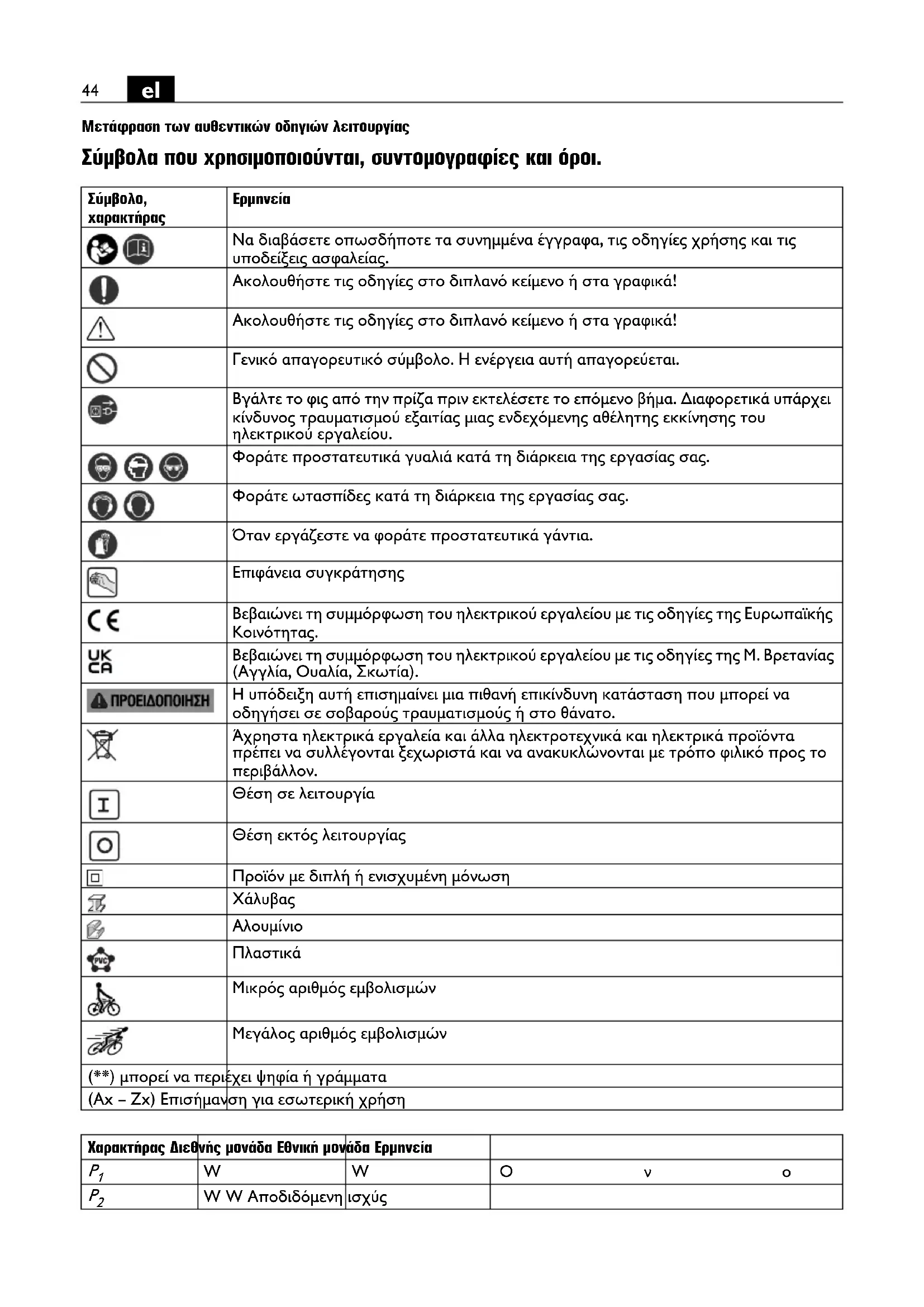 Να διαβάσετε οπωσδήποτε τα συνημμένα έγγραφα, τις οδηγίες χρήσης και τις υποδείξεις ασφαλείας. Ακολουθήστε τις οδηγίες στο διπλανό κείμενο ή στα γραφικά! Ακολουθήστε τις οδηγίες στο διπλανό κείμενο ή στα γραφικά! Γενικό απαγορευτικό σύμβολο. Η ενέργεια αυτή απαγορεύεται. Βγάλτε το φις από την πρίζα πριν εκτελέσετε το επόμενο βήμα. Διαφορετικά υπάρχει κίνδυνος τραυματισμού εξαιτίας μιας ενδεχόμενης αθέλητης εκκίνησης του ηλεκτρικού εργαλείου. Φοράτε προστατευτικά γυαλιά κατά τη διάρκεια της εργασίας σας. Φοράτε ωτασπίδες κατά τη διάρκεια της εργασίας σας. Όταν εργάζεστε να φοράτε προστατευτικά γάντια. Επιφάνεια συγκράτησης Βεβαιώνει τη συμμόρφωση του ηλεκτρικού εργαλείου με τις οδηγίες της Ευρωπαϊκής Κοινότητας. Βεβαιώνει τη συμμόρφωση του ηλεκτρικού εργαλείου με τις οδηγίες της Μ. Βρετανίας (Αγγλία, Ουαλία, Σκωτία). Η υπόδειξη αυτή επισημαίνει μια πιθανή επικίνδυνη κατάσταση που μπορεί να οδηγήσει σε σοβαρούς τραυματισμούς ή στο θάνατο. Άχρηστα ηλεκτρικά εργαλεία και άλλα ηλεκτροτεχνικά και ηλεκτρικά προϊόντα πρέπει να συλλέγονται ξεχωριστά και να ανακυκλώνονται με τρόπο φιλικό προς το περιβάλλον. Θέση σε λειτουργία Θέση εκτός λειτουργίας Προϊόν με διπλή ή ενισχυμένη μόνωση