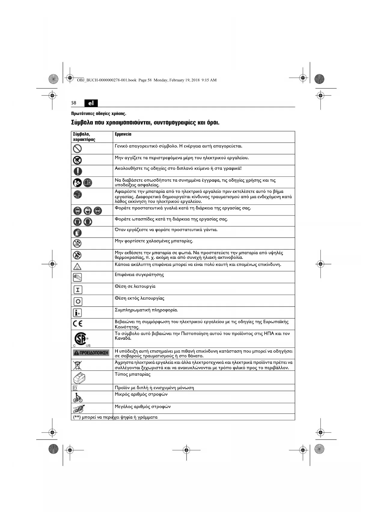 Η υπόδειξη αυτή επισημαίνει μια πιθανή επικίνδυνη κατάσταση που μπορεί να οδηγήσει σε σοβαρούς τραυματισμούς ή στο θάνατο. Άχρηστα ηλεκτρικά εργαλεία και άλλα ηλεκτροτεχνικά και ηλεκτρικά προϊόντα πρέπει να συλλέγονται ξεχωριστά και να ανακυκλώνονται με τρόπο φιλικό προς το περιβάλλον. Τύπος μπαταρίας Προϊόν με διπλή ή ενισχυμένη μόνωση Μικρός αριθμός στροφών Μεγάλος αριθμός στροφών (**) μπορεί να περιέχει ψηφία ή γράμματα OBJ_BUCH-0000000278-001.book Page 58 Monday, February 19, 2018 9:15 AM59
