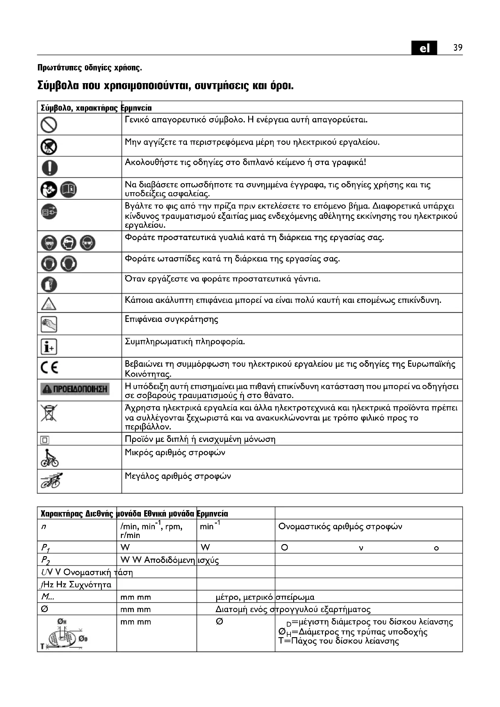 Πρωτότυπες οδηγίες χρήσης. Σύμβολα που χρησιμοποιούνται, συντμήσεις και όροι. Σύμβολο, χαρακτήρας Ερμηνεία Γενικό απαγορευτικό σύμβολο. Η ενέργεια αυτή απαγορεύεται. Μην αγγίζετε τα περιστρεφόμενα μέρη του ηλεκτρικού εργαλείου. Ακολουθήστε τις οδηγίες στο διπλανό κείμενο ή στα γραφικά! Να διαβάσετε οπωσδήποτε τα συνημμένα έγγραφα, τις οδηγίες χρήσης και τις υποδείξεις ασφαλείας. Βγάλτε το φις από την πρίζα πριν εκτελέσετε το επόμενο βήμα. Διαφορετικά υπάρχει κίνδυνος τραυματισμού εξαιτίας μιας ενδεχόμενης αθέλητης εκκίνησης του ηλεκτρικού