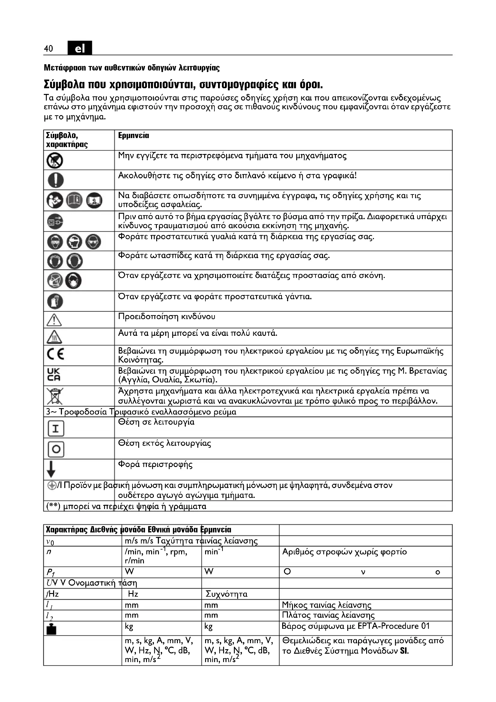 Μην εγγίζετε τα περιστρεφόμενα τμήματα του μηχανήματος Ακολουθήστε τις οδηγίες στο διπλανό κείμενο ή στα γραφικά! Να διαβάσετε οπωσδήποτε τα συνημμένα έγγραφα, τις οδηγίες χρήσης και τις υποδείξεις ασφαλείας. Πριν από αυτό το βήμα εργασίας βγάλτε το βύσμα από την πρίζα. Διαφορετικά υπάρχει κίνδυνος τραυματισμού από ακούσια εκκίνηση της μηχανής. Φοράτε προστατευτικά γυαλιά κατά τη διάρκεια της εργασίας σας. Φοράτε ωτασπίδες κατά τη διάρκεια της εργασίας σας. Όταν εργάζεστε να χρησιμοποιείτε διατάξεις προστασίας από σκόνη. Όταν εργάζεστε να φοράτε προστατευτικά γάντια. Προειδοποίηση κινδύνου Αυτά τα μέρη μπορεί να είναι πολύ καυτά. Βεβαιώνει τη συμμόρφωση του ηλεκτρικού εργαλείου με τις οδηγίες της Ευρωπαϊκής Κοινότητας. Βεβαιώνει τη συμμόρφωση του ηλεκτρικού εργαλείου με τις οδηγίες της Μ. Βρετανίας (Αγγλία, Ουαλία, Σκωτία). Άχρηστα μηχανήματα και άλλα ηλεκτροτεχνικά και ηλεκτρικά εργαλεία πρέπει να συλλέγονται χωριστά και να ανακυκλώνονται με τρόπο φιλικό προς το περιβάλλον. 3~ Τροφοδοσία Τριφασικό εναλλασσόμενο ρεύμα Θέση σε λειτουργία Θέση εκτός λειτουργίας Φορά περιστροφής /I Προϊόν με βασική μόνωση και συμπληρωματική μόνωση με ψηλαφητά, συνδεμένα στον ουδέτερο αγωγό αγώγιμα τμήματα. (**) μπορεί να περιέχει ψηφία ή γράμματα Χαρακτήρας Διεθνής μονάδα Εθνική μονάδα Ερμηνεία