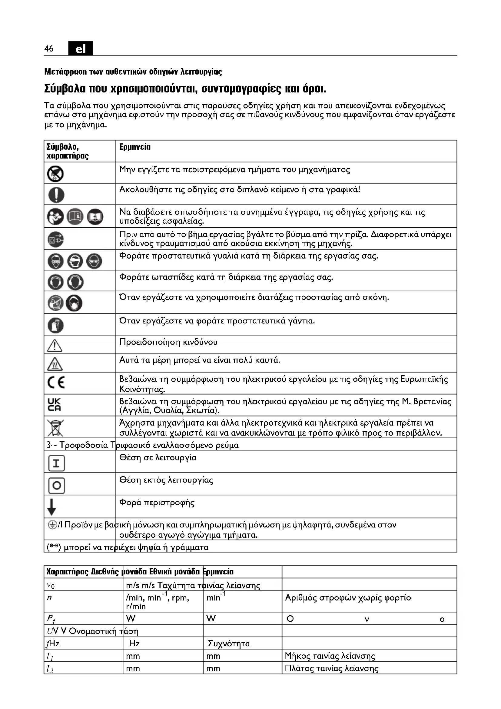Μην εγγίζετε τα περιστρεφόμενα τμήματα του μηχανήματος Ακολουθήστε τις οδηγίες στο διπλανό κείμενο ή στα γραφικά! Να διαβάσετε οπωσδήποτε τα συνημμένα έγγραφα, τις οδηγίες χρήσης και τις υποδείξεις ασφαλείας. Πριν από αυτό το βήμα εργασίας βγάλτε το βύσμα από την πρίζα. Διαφορετικά υπάρχει κίνδυνος τραυματισμού από ακούσια εκκίνηση της μηχανής. Φοράτε προστατευτικά γυαλιά κατά τη διάρκεια της εργασίας σας. Φοράτε ωτασπίδες κατά τη διάρκεια της εργασίας σας. Όταν εργάζεστε να χρησιμοποιείτε διατάξεις προστασίας από σκόνη. Όταν εργάζεστε να φοράτε προστατευτικά γάντια. Προειδοποίηση κινδύνου Αυτά τα μέρη μπορεί να είναι πολύ καυτά. Βεβαιώνει τη συμμόρφωση του ηλεκτρικού εργαλείου με τις οδηγίες της Ευρωπαϊκής Κοινότητας. Βεβαιώνει τη συμμόρφωση του ηλεκτρικού εργαλείου με τις οδηγίες της Μ. Βρετανίας (Αγγλία, Ουαλία, Σκωτία). Άχρηστα μηχανήματα και άλλα ηλεκτροτεχνικά και ηλεκτρικά εργαλεία πρέπει να συλλέγονται χωριστά και να ανακυκλώνονται με τρόπο φιλικό προς το περιβάλλον. 3~ Τροφοδοσία Τριφασικό εναλλασσόμενο ρεύμα Θέση σε λειτουργία Θέση εκτός λειτουργίας Φορά περιστροφής /I Προϊόν με βασική μόνωση και συμπληρωματική μόνωση με ψηλαφητά, συνδεμένα στον ουδέτερο αγωγό αγώγιμα τμήματα. (**) μπορεί να περιέχει ψηφία ή γράμματα Χαρακτήρας Διεθνής μονάδα Εθνική μονάδα Ερμηνεία