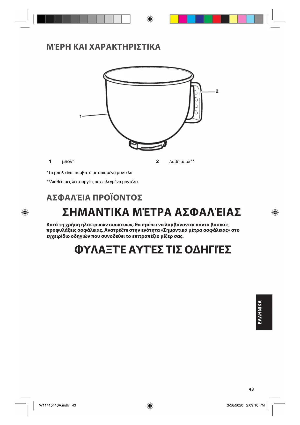 ΜΈΡΗ ΚΑΙ ΧΑΡΑΚΤΗΡΙΣΤΙΚΑ ΑΣΦΑΛΈΙΑ ΠΡΟΪΟΝΤΟΣ ΣΗΜΑΝΤΙΚΑ ΜΈΤΡΑ ΑΣΦΑΛΈΙΑΣ Κατά τη χρήση ηλεκτρικών συσκευών, θα πρέπει να λαμβάνονται πάντα βασικές προφυλάξεις ασφάλειας. Ανατρέξτε στην ενότητα «Σημαντικά μέτρα ασφάλειας» στο εγχειρίδιο οδηγιών που συνοδεύει το επιτραπέζιο μίξερ σας. ΦΥΛΑΞΤΈ ΑΥΤΈΣ ΤΙΣ ΟΔΗΓΙΈΣ *Το μπολ είναι συμβατό με ορισμένα μοντέλα. **Διαθέσιμες λειτουργίες σε επιλεγμένα μοντέλα.