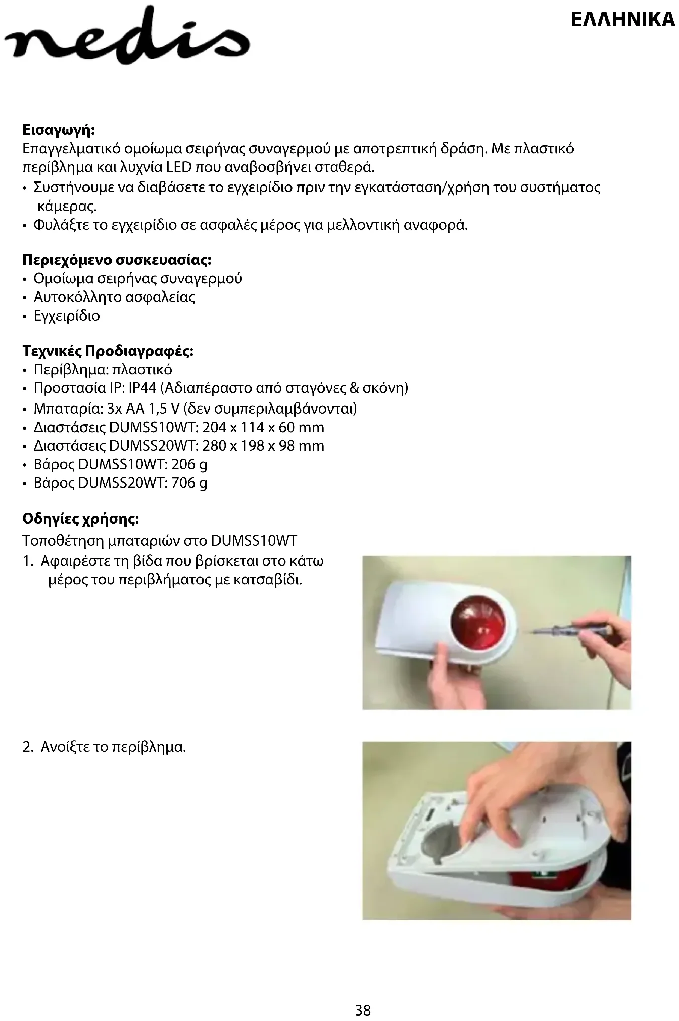- Για περισσότερες πληροφορίες επικοινωνήστε με τον αντιπρόσωπό σας ή τις τοπικές αρχές διαχείρισης αποβλήτων. Το προϊόν αυτό κατασκευάστηκε και παρέχεται σε συμμόρφωση με το σύνολο των αντίστοιχων κανονισμών και οδηγιών που ισχύουν για τα κράτη μέλη της Ευρωπαϊκής Ένωσης. Επίσης, συμμορφώνεται με το σύνολο των ισχυουσών προδιαγραφών και κανονισμών της χώρας διάθεσης. Επίσημη τεκμηρίωση διατίθεται κατόπιν αιτήματος. Η τεκμηρίωση περιλαμβάνει, χωρίς περιορισμό, τα εξής: Δήλωση Συμμόρφωσης (και ταυτότητα προϊόντος), Δελτίο Δεδομένων Ασφάλειας Υλικού, έκθεση δοκιμής προϊόντος. Επικοινωνήστε με το τμήμα εξυπηρέτησης πελατών μας για υποστήριξη: από τον ιστότοπο: http://www.nedis.com/en-us/contact/contact-form.htm μέσω ηλεκτρονικού ταχυδρομείου: service@nedis.com Τηλεφωνικά: +31 (0)73-5991055 (κατά τη διάρκεια των ωρών εργασίας) NEDIS B.V., De Tweeling 28, 5215 MC ’s-Hertogenbosch, ΟΛΛΑΝΔΙΑ41 DANSK Introduktion: Professionelt udseende attrap-alarmsirene med afskrækkende funktion. Kabinet fremstillet i plastik og udstyret med et kontinuerligt blinkende LED-lys.