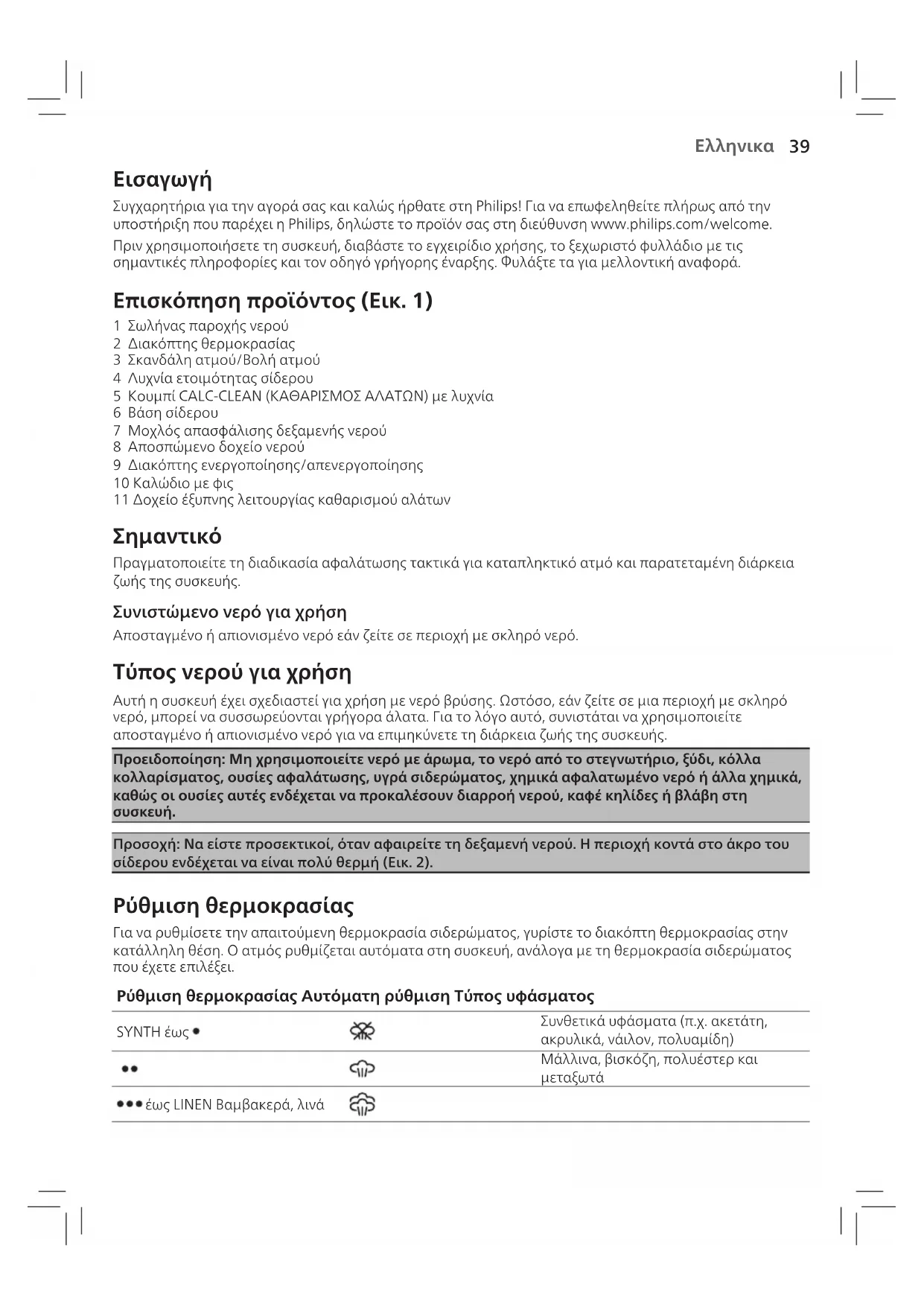 1 Σωλήνας παροχής νερού 2 Διακόπτης θερμοκρασίας 3 Σκανδάλη ατμού/Βολή ατμού 4 Λυχνία ετοιμότητας σίδερου 5 Κουμπί CALC-CLEAN )ΚΑΘΑΡΙΣΜΟΣ ΑΛΑΤΩΝ( με λυχνία 6 Βάση σίδερου 7 Μοχλός απασφάλισης δεξαμενής νερού 8 Αποσπώμενο δοχείο νερού 9 Διακόπτης ενεργοποίησης/απενεργοποίησης 10 Καλώδιο με φις 11 Δοχείο έξυπνης λειτουργίας καθαρισμού αλάτων