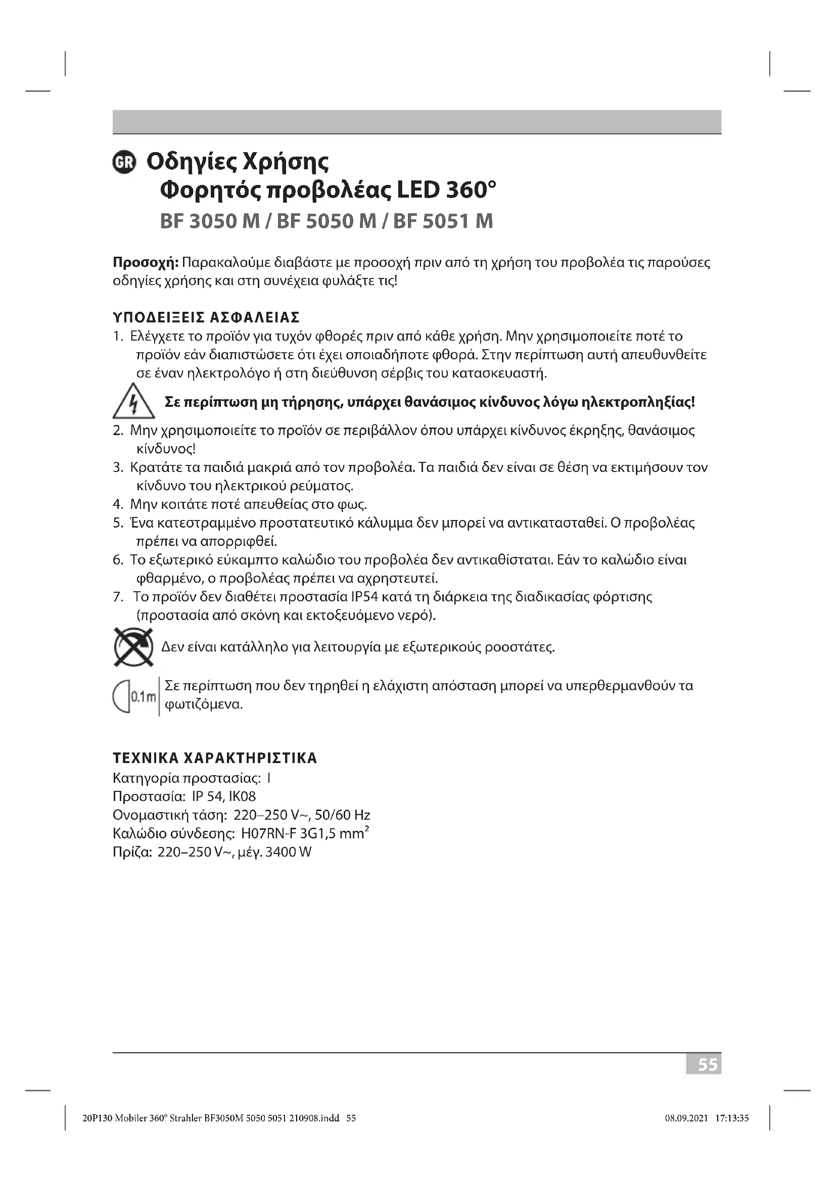 (προστασία από σκόνη και εκτοξευόμενο νερό). Δεν είναι κατάλληλο για λειτουργία με εξωτερικούς ροοστάτες. Σε περίπτωση που δεν τηρηθεί η ελάχιστη απόσταση μπορεί να υπερθερμανθούν τα φωτιζόμενα. ΤΕΧΝΙΚΑ ΧΑΡΑΚΤΗΡΙΣΤΙΚΑ Κατηγορία προστασίας: I Προστασία: IP 54, IK08 Ονομαστική τάση: 220–250 V~, 50/60 Hz Καλώδιο σύνδεσης: H07RN-F 3G1,5 mm² Πρίζα: 220–250 V~, μέγ. 3400 W 20P130 Mobiler 360° Strahler BF3050M 5050 5051 210908.indd 5520P130 Mobiler 360° Strahler BF3050M 5050 5051 210908.indd 55 08.09.2021 17:13:3508.09.2021 17:13:355656 Οδηγίες Χρήσης BF 3050 M / BF 5050 M / BF 5051 M Τύπος: BF 3050 M BF 5050 M BF 5051 M Αριθμός προϊόντος: 1171410900 1171410902 1171411902 Φις: DE DE FR Απορροφούμενη ισχύς (W): 30 50 50 Μέγ. ρεύμα (Α): 0,75 1,22 1,22 Διαστάσεις (mm): 205 x 211 x 222,5 205 x 211 x 222,5 205 x 211 x 222,5 Διαστάσεις προστατευτικού καλύμματος (mm): 200 Ø x 85,8 υ 200 Ø x 85,8 υ 200 Ø x 85,8 υ Βάρος (kg): 1,85 2,85 2,85 Συντελεστής ισχύος: >0,9 >0,9 >0,9 Mέγ. επιφάνεια φωτισμού (cm²): 456 456 456 Αυτός ο προβολέας LED είναι κατάλληλος για φωτισμό σε εσωτερικούς κι εξωτερικούς χώρους. ΕΝΕΡΓΟΠΟΊΗΣΗ ΕΝΕΡΓΟΠΟΙΗΣΗ/ΑΠΕΝΕΡΓΟΠΟΙΗΣΗ ΤΟΥ ΠΡΟΒΟΛΕΑ Τοποθετήστε τον προβολέα και ενεργοποιήστε τον με τον διακόπτη (Α). Ο προβολέας φωτίζει με 100 % ένταση φωτός, η οποία με άλλο ένα πάτημα ρυθμίζεται στο 50 %, ενώ ένα ακόμα πάτημα απενεργοποιεί τον προβολέα. A: Διακόπτης ενεργοποίησης/απενεργοποίησης και λειτουργίας B: Πρίζα C: Άγκιστρο