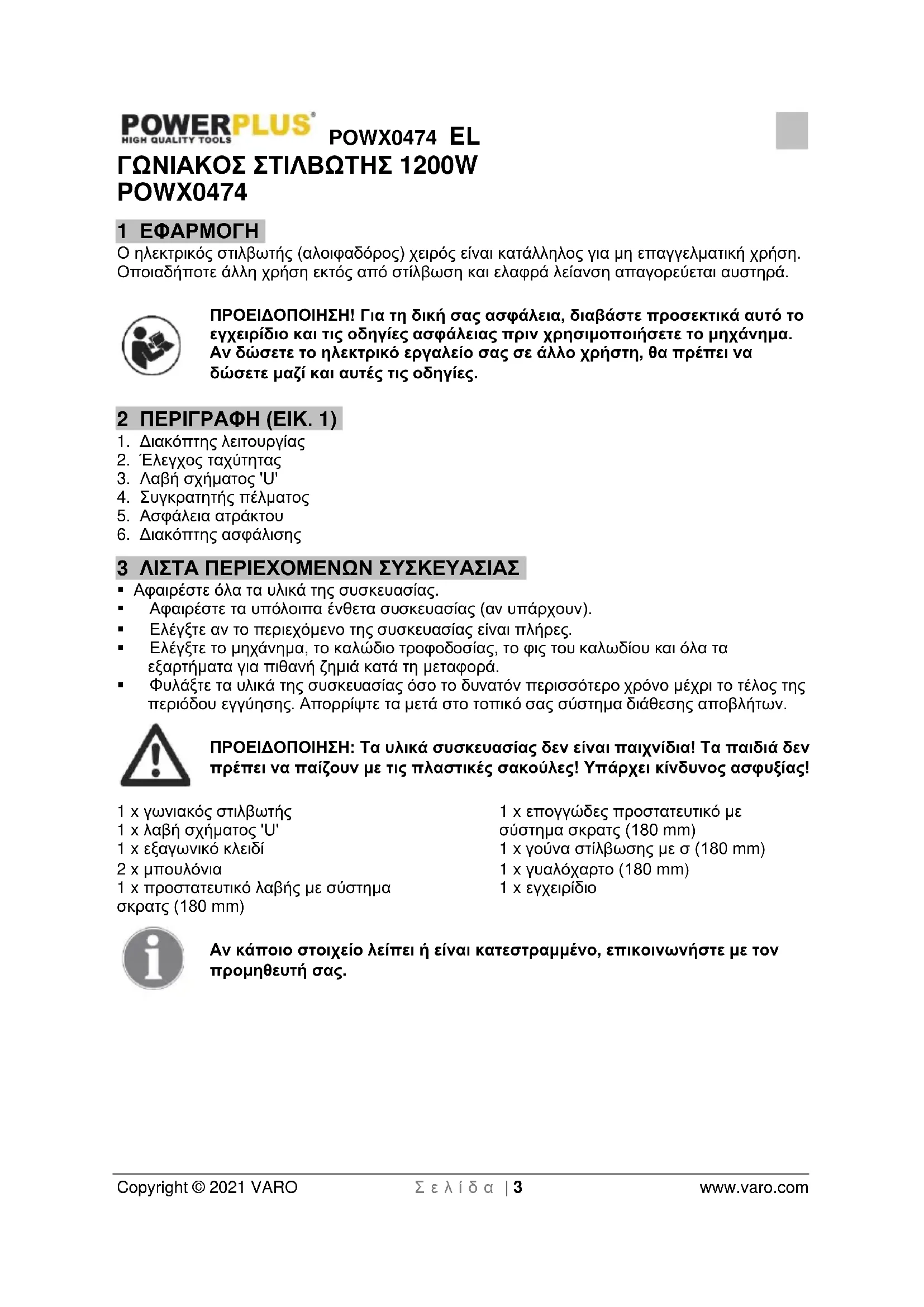 - 15 ΔΗΛΩΣΗ ΣΥΜΜΟΡΦΩΣΗΣ POWX0474 EL Copyright © 2021 VARO Σ ε λ ί δ α | 3 www.varo.com ΓΩΝΙΑΚΟΣ ΣΤΙΛΒΩΤΗΣ 1200W POWX0474 1 ΕΦΑΡΜΟΓΗ Ο ηλεκτρικός στιλβωτής (αλοιφαδόρος) χειρός είναι κατάλληλος για μη επαγγελματική χρήση. Οποιαδήποτε άλλη χρήση εκτός από στίλβωση και ελαφρά λείανση απαγορεύεται αυστηρά. ΠΡΟΕΙΔΟΠΟΙΗΣΗ! Για τη δική σας ασφάλεια, διαβάστε προσεκτικά αυτό το εγχειρίδιο και τις οδηγίες ασφάλειας πριν χρησιμοποιήσετε το μηχάνημα. Αν δώσετε το ηλεκτρικό εργαλείο σας σε άλλο χρήστη, θα πρέπει να δώσετε μαζί και αυτές τις οδηγίες. 2 ΠΕΡΙΓΡΑΦΗ (ΕΙΚ. 1) p. 11