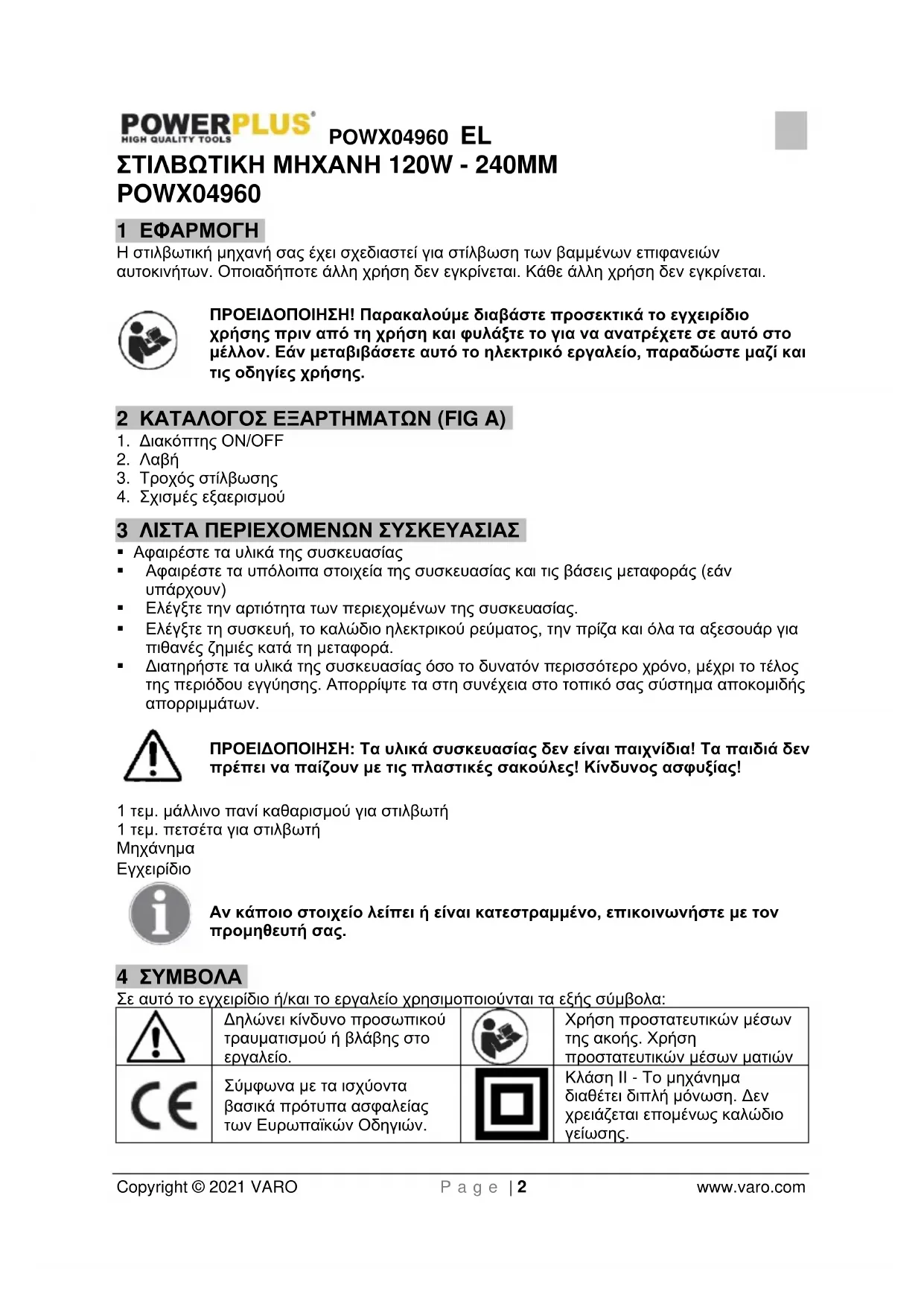 Κλάση II - Το μηχάνημα διαθέτει διπλή μόνωση. Δεν χρειάζεται επομένως καλώδιο γείωσης.POWX04960 EL Copyright © 2021 VARO P a g e | 3 www.varo.com 5 ΓΕΝΙΚΕΣ ΣΥΜΒΟΥΛΕΣ ΓΙΑ ΤΗΝ ΑΣΦΑΛΕΙΑ Διαβάστε όλες τις προειδοποιήσεις και οδηγίες. Η μη τήρηση των προειδοποιήσεων και οδηγιών μπορούν να αποτελέσουν αιτία ηλεκτροπληξίας, φωτιάς ή/και σοβαρών τραυματισμών. Ο όρος «ηλεκτρικό εργαλείο» που χρησιμοποιείται στις προειδοποιήσεις αναφέρεται σε ηλεκτρικά εργαλεία που λειτουργούν με τροφοδοσία ρεύματος (με καλώδιο τροφοδοσίας) ή με μπαταρία (ασύρματα).