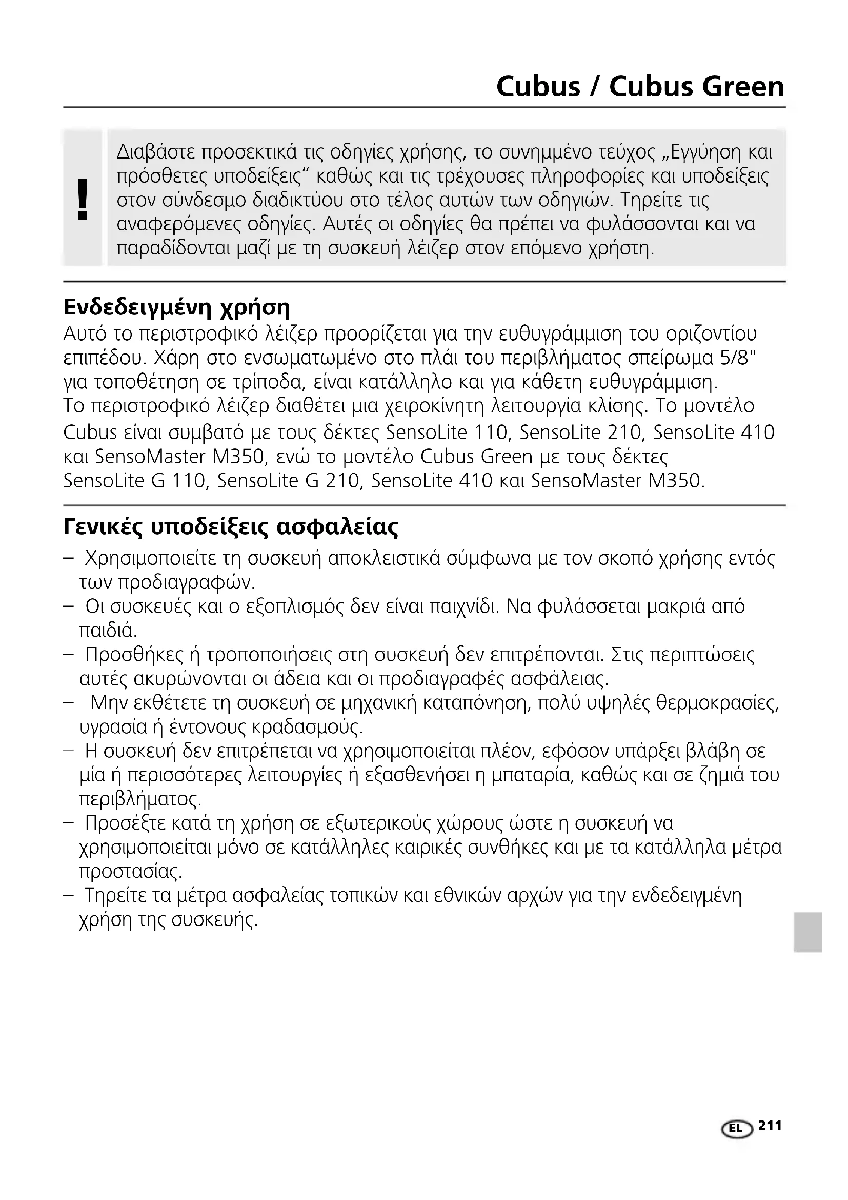 Ενδεδειγμένη χρήση Αυτό το περιστροφικό λέιζερ προορίζεται για την ευθυγράμμιση του οριζοντίου επιπέδου. Χάρη στο ενσωματωμένο στο πλάι του περιβλήματος σπείρωμα 5/8" για τοποθέτηση σε τρίποδα, είναι κατάλληλο και για κάθετη ευθυγράμμιση. Το περιστροφικό λέιζερ διαθέτει μια χειροκίνητη λειτουργία κλίσης. Το μοντέλο Cubus είναι συμβατό με τους δέκτες SensoLite 110, SensoLite 210, SensoLite 410 και SensoMaster M350, ενώ το μοντέλο Cubus Green με τους δέκτες SensoLite G 110, SensoLite G 210, SensoLite 410 και SensoMaster M350. EL212