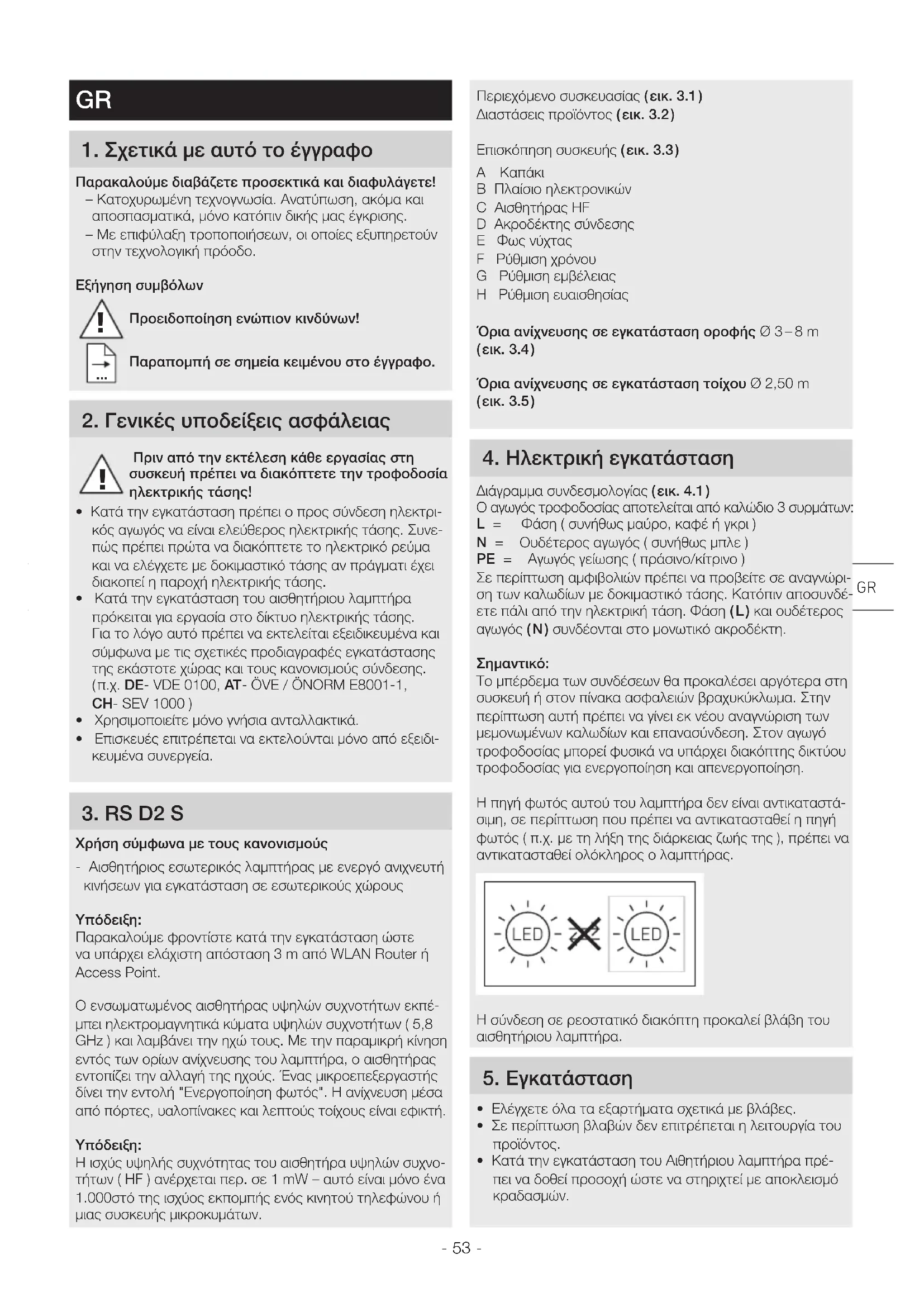 Προειδοποίηση ενώπιον κινδύνων! Παραπομπή σε σημεία κειμένου στο έγγραφο 2 Γενικές υποδείξεις ασφάλειας Πριν από την εκτέλεση κάθε εργασίας στη συσκευή πρέπει να διακόπτετε την τροφοδοσία ηλεκτρικής τάσης! • Κατά την εγκατάσταση πρέπει ο προς σύνδεση ηλεκτρι-κός αγωγός να είναι ελεύθερος ηλεκτρικής τάσης. Συνε-πώς πρέπει πρώτα να διακόπτετε το ηλεκτρικό ρεύμα και να ελέγχετε με δοκιμαστικό τάσης αν πράγματι έχει διακοπεί η παροχή ηλεκτρικής τάσης. • Κατά την εγκατάσταση του αισθητήριου λαμπτήρα πρόκειται για εργασία στο δίκτυο ηλεκτρικής τάσης. Για το λόγο αυτό πρέπει να εκτελείται εξειδικευμένα και σύμφωνα με τις σχετικές προδιαγραφές εγκατάστασης της εκάστοτε χώρας και τους κανονισμούς σύνδεσης. ( π.χ. DE- VDE 0100, AT- ÖVE / ÖNORM E8001-1, CH- SEV 1000 )• Χρησιμοποιείτε μόνο γνήσια ανταλλακτικά.• Επισκευές επιτρέπεται να εκτελούνται μόνο από εξειδι-κευμένα συνεργεία. 3 RS D2 S Χρήση σύμφωνα με τους κανονισμούς- Αισθητήριος εσωτερικός λαμπτήρας με ενεργό ανιχνευτή κινήσεων για εγκατάσταση σε εσωτερικούς χώρουςΥπόδειξη: Παρακαλούμε φροντίστε κατά την εγκατάσταση ώστε να υπάρχει ελάχιστη απόσταση 3 m από WLAN Router ή Access Point.Ο ενσωματωμένος αισθητήρας υψηλών συχνοτήτων εκπέ-μπει ηλεκτρομαγνητικά κύματα υψηλών συχνοτήτων ( 5,8 GHz ) και λαμβάνει την ηχώ τους. Με την παραμικρή κίνηση εντός των ορίων ανίχνευσης του λαμπτήρα, ο αισθητήρας εντοπίζει την αλλαγή της ηχούς. Ένας μικροεπεξεργαστής δίνει την εντολή "Ενεργοποίηση φωτός". Η ανίχνευση μέσα από πόρτες, υαλοπίνακες και λεπτούς τοίχους είναι εφικτή. Υπόδειξη: H ισχύς υψηλής συχνότητας του αισθητήρα υψηλών συχνο-τήτων ( HF ) ανέρχεται περ. σε 1 mW – αυτό είναι μόνο ένα 1.000στό της ισχύος εκπομπής ενός κινητού τηλεφώνου ή μιας συσκευής μικροκυμάτων.