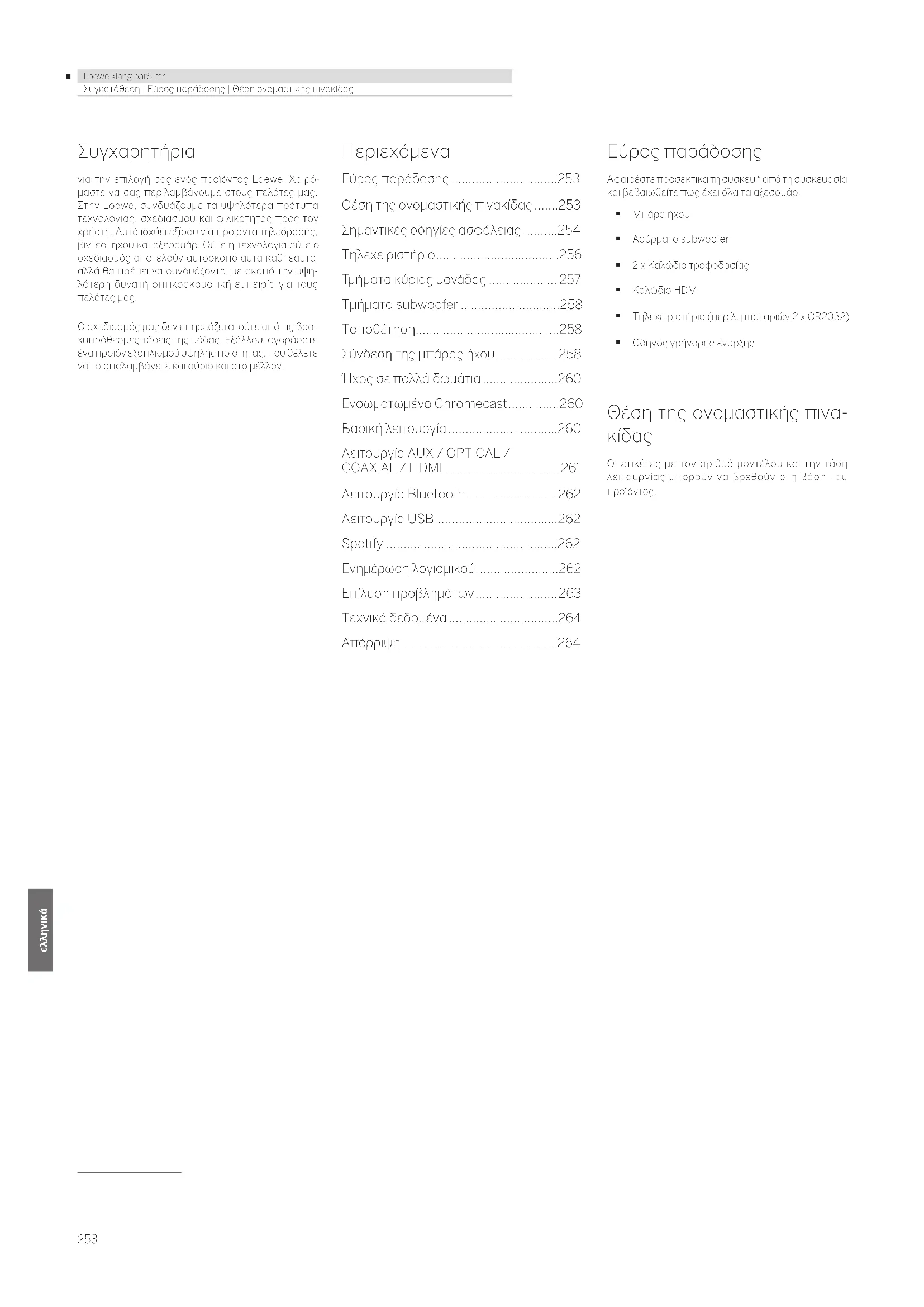 - Συγκατάθεση | Εύρος παράδοσης | Θέση ονομαστικής πινακίδας Συγχαρητήρια για την επιλογή σας ενός προϊόντος Loewe. Χαιρό- μαστε να σας περιλαμβάνουμε στους πελάτες μας. Στην Loewe, συνδυάζουμε τα υψηλότερα πρότυπα τεχνολογίας, σχεδιασμού και φιλικότητας προς τον χρήστη. Αυτό ισχύει εξίσου για προϊόντα τηλεόρασης, βίντεο, ήχου και αξεσουάρ. Ούτε η τεχνολογία ούτε ο σχεδιασμός αποτελούν αυτοσκοπό αυτά καθ’ εαυτά, αλλά θα πρέπει να συνδυάζονται με σκοπό την υψη- λότερη δυνατή οπτικοακουστική εμπειρία για τους πελάτες μας. Ο σχεδιασμός μας δεν επηρεάζεται ούτε από τις βρα- χυπρόθεσμες τάσεις της μόδας. Εξάλλου, αγοράσατε ένα προϊόν εξοπλισμού υψηλής ποιότητας, που θέλετε να το απολαμβάνετε και αύριο και στο μέλλον. Περιεχόμενα Εύρος παράδοσης p. 253