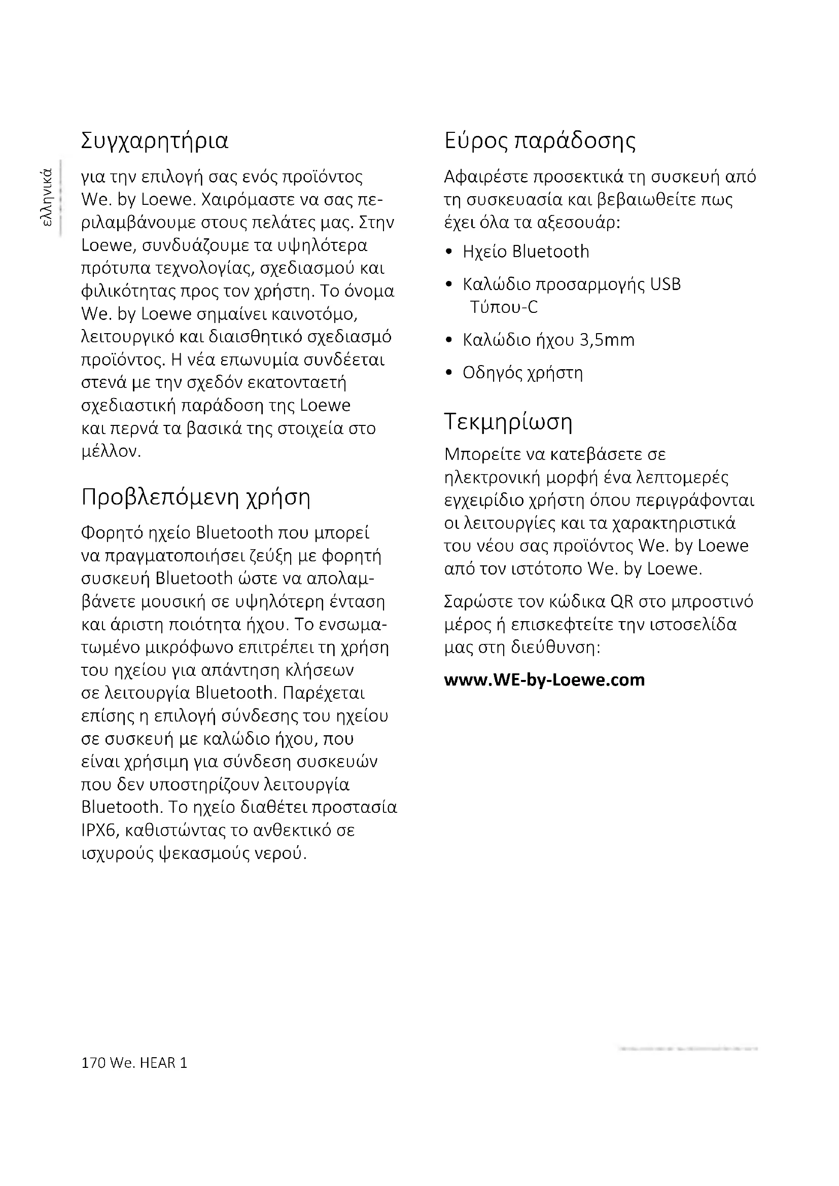 Μπορείτε να κατεβάσετε σε ηλεκτρονική μορφή ένα λεπτομερές εγχειρίδιο χρήστη όπου περιγράφονται οι λειτουργίες και τα χαρακτηριστικά του νέου σας προϊόντος We. by Loewe από τον ιστότοπο We. by Loewe. Σαρώστε τον κώδικα QR στο μπροστινό μέρος ή επισκεφτείτε την ιστοσελίδα μας στη διεύθυνση: www.WE-by-Loewe.comWe. HEAR 1 171