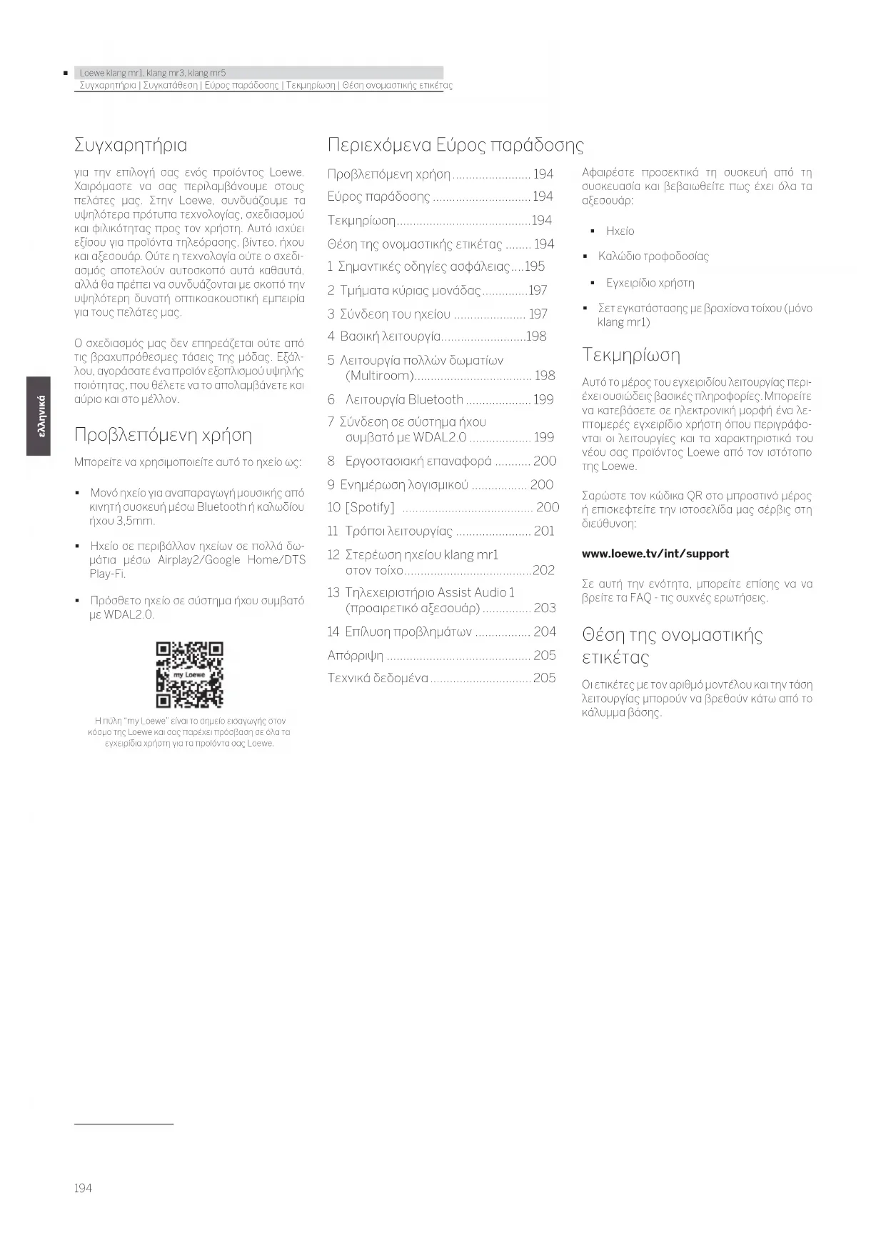 Loewe klang mr1, klang mr3, klang mr5 deutsch românăΣυγχαρητήρια | Συγκατάθεση | Εύρος παράδοσης | Τεκμηρίωση | Θέση ονομαστικής ετικέτας Συγχαρητήρια για την επιλογή σας ενός προϊόντος Loewe. Χαιρόμαστε να σας περιλαμβάνουμε στους πελάτες μας. Στην Loewe, συνδυάζουμε τα υψηλότερα πρότυπα τεχνολογίας, σχεδιασμού και φιλικότητας προς τον χρήστη. Αυτό ισχύει εξίσου για προϊόντα τηλεόρασης, βίντεο, ήχου και αξεσουάρ. Ούτε η τεχνολογία ούτε ο σχεδι- ασμός αποτελούν αυτοσκοπό αυτά καθαυτά, αλλά θα πρέπει να συνδυάζονται με σκοπό την υψηλότερη δυνατή οπτικοακουστική εμπειρία για τους πελάτες μας. Ο σχεδιασμός μας δεν επηρεάζεται ούτε από τις βραχυπρόθεσμες τάσεις της μόδας. Εξάλ- λου, αγοράσατε ένα προϊόν εξοπλισμού υψηλής ποιότητας, που θέλετε να το απολαμβάνετε και αύριο και στο μέλλον. Προβλεπόμενη χρήση Μπορείτε να χρησιμοποιείτε αυτό το ηχείο ως: Μονό ηχείο για αναπαραγωγή μουσικής από κινητή συσκευή μέσω Bluetooth ή καλωδίου ήχου 3,5mm. Ηχείο σε περιβάλλον ηχείων σε πολλά δω- μάτια μέσω Airplay2/Google Home/DTS Play-Fi. Πρόσθετο ηχείο σε σύστημα ήχου συμβατό με WDAL2.0. Η πύλη “my Loewe” είναι το σημείο εισαγωγής στον κόσμο της Loewe και σας παρέχει πρόσβαση σε όλα τα εγχειρίδια χρήστη για τα προϊόντα σας Loewe. Περιεχόμενα Εύρος παράδοσης Αφαιρέστε προσεκτικά τη συσκευή από τη συσκευασία και βεβαιωθείτε πως έχει όλα τα