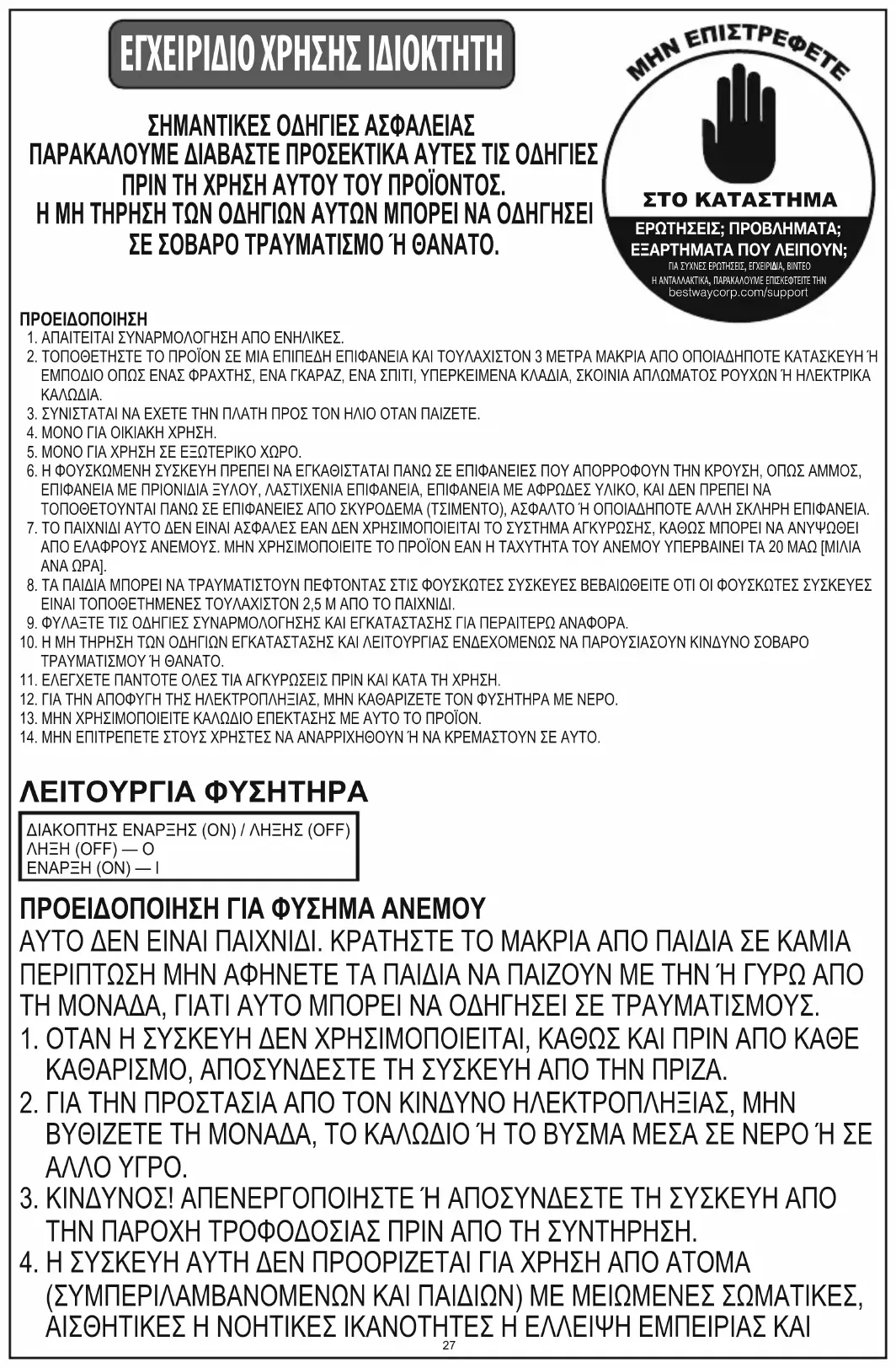 ΕΡΩΤΗΣΕΙΣ; ΠΡΟΒΛΗΜΑΤΑ;ΕΞΑΡΤΗΜΑΤΑ ΠΟΥ ΛΕΙΠΟΥΝ; ΓΙΑ ΣΥΧΝΕΣ ΕΡΩΤΗΣΕΙΣ, ΕΓΧΕΙΡΙ∆ΙΑ, ΒΙΝΤΕΟ Η ΑΝΤΑΛΛΑΚΤΙΚΑ, ΠΑΡΑΚ ΑΛΟΥΜΕ ΕΠΙΣΚΕΦΤΕΙΤΕ ΤΗΝ bestwaycorp.com/support ΣΤΟ ΚΑΤΑΣΤΗΜΑ ΕΓΧΕΙΡΙΔΙΟ ΧΡΗΣΗΣ ΙΔΙΟΚΤΗΤΗΠΡΟΕΙΔΟΠΟΙΗΣΗ ΓΙΑ ΦΥΣΗΜΑ ΑΝΕΜΟΥ ΑΥΤΟ ΔΕΝ ΕΙΝΑΙ ΠΑΙΧΝΙΔΙ. ΚΡΑΤΗΣΤΕ ΤΟ ΜΑΚΡΙΑ ΑΠΟ ΠΑΙΔΙΑ ΣΕ ΚΑΜΙΑ ΠΕΡΙΠΤΩΣΗ ΜΗΝ ΑΦΗΝΕΤΕ ΤΑ ΠΑΙΔΙΑ ΝΑ ΠΑΙΖΟΥΝ ΜΕ ΤΗΝ Ή ΓΥΡΩ ΑΠΟ ΤΗ ΜΟΝΑΔΑ, ΓΙΑΤΙ ΑΥΤΟ ΜΠΟΡΕΙ ΝΑ ΟΔΗΓΗΣΕΙ ΣΕ ΤΡΑΥΜΑΤΙΣΜΟΥΣ.
