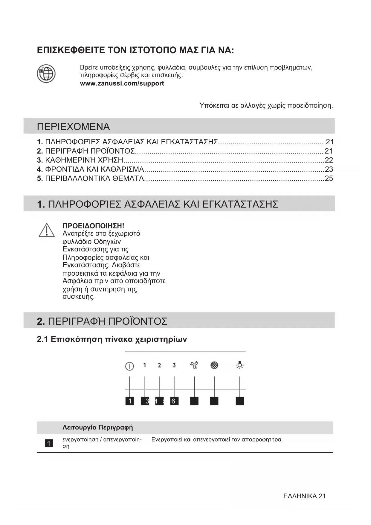 Ανακυκλώστε τα υλικά που φέρουν το σύμβολο . Τοποθετήστε τα υλικά συσκευασίας σε κατάλληλα δοχεία για ανακύκλωση. Συμβάλετε στην προστασία του περιβάλλοντος και της ανθρώπινης υγείας ανακυκλώνοντας τις άχρηστες ηλεκτρικές και ηλεκτρονικές συσκευές. Μην απορρίπτετε με τα οικιακά απορρίμματα συσκευές που φέρουν το σύμβολο . Επιστρέψτε το προϊόν στην τοπική σας μονάδα ανακύκλωσης ή επικοινωνήστε με τη δημοτική αρχή. ΕΛΛΗΝΙΚΑ 25VISIT OUR WEBSITE TO: Get usage advice, brochures, trouble shooter, service and repair information:www.zanussi.com/support Subject to change without notice. CONTENTS