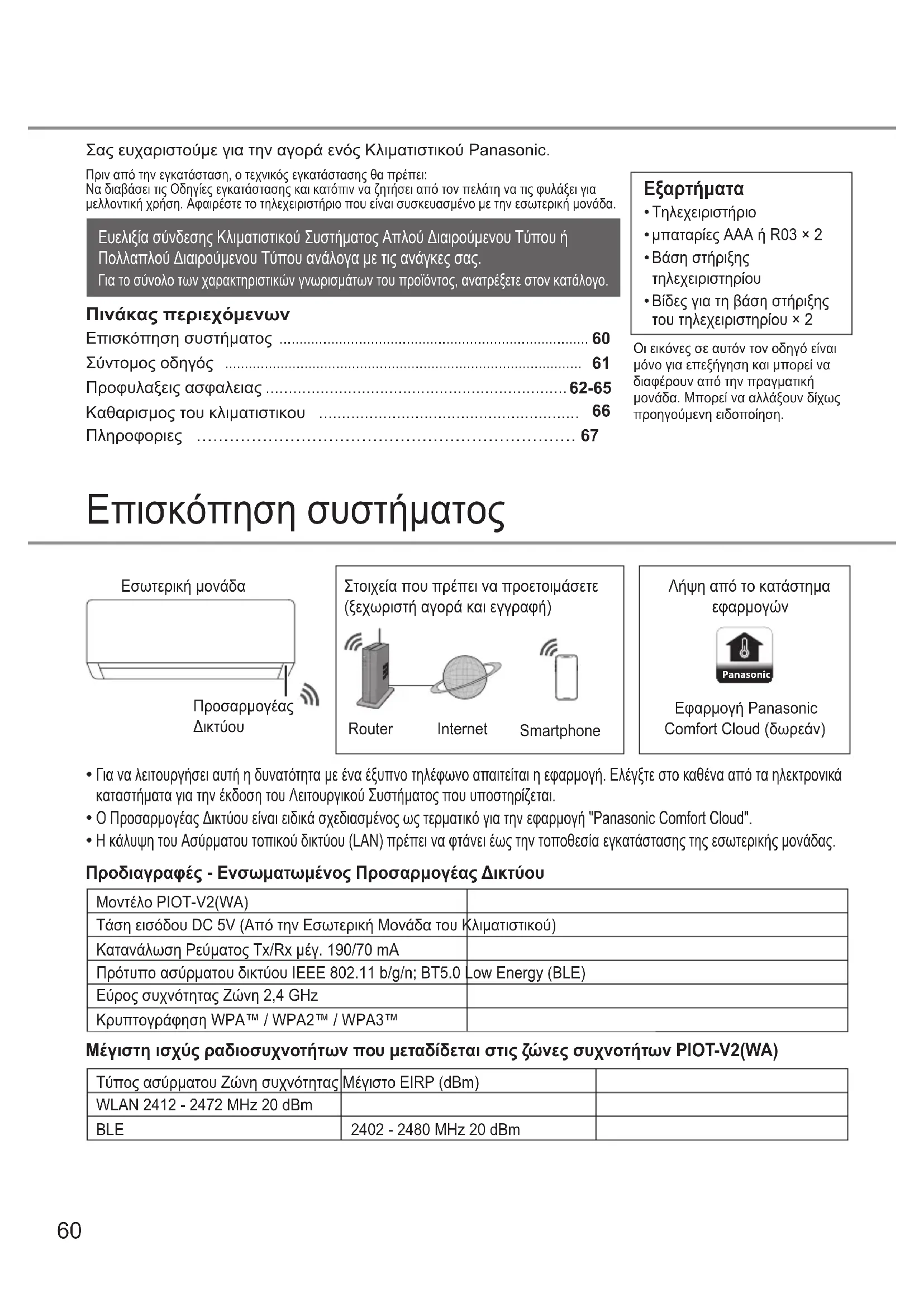 Πληροφοριες …………………………………………………………… 67 Μοντέλο PIOT-V2(WA) Τάση εισόδου DC 5V (Από την Εσωτερική Μονάδα του Κλιματιστικού) Κατανάλωση Ρεύματος Tx/Rx μέγ. 190/70 mA Πρότυπο ασύρματου δικτύου IEEE 802.11 b/g/n; BT5.0 Low Energy (BLE) Εύρος συχνότητας Ζώνη 2,4 GHz Κρυπτογράφηση WPA™ / WPA2™ / WPA3™ Προδιαγραφές - Ενσωματωμένος Προσαρμογέας Δικτύου Μέγιστη ισχύς ραδιοσυχνοτήτων που μεταδίδεται στις ζώνες συχνοτήτων PIOT-V2(WA) Τύπος ασύρματου Ζώνη συχνότητας Μέγιστο EIRP (dBm) WLAN 2412 - 2472 MHz 20 dBm BLE 2402 - 2480 MHz 20 dBm61