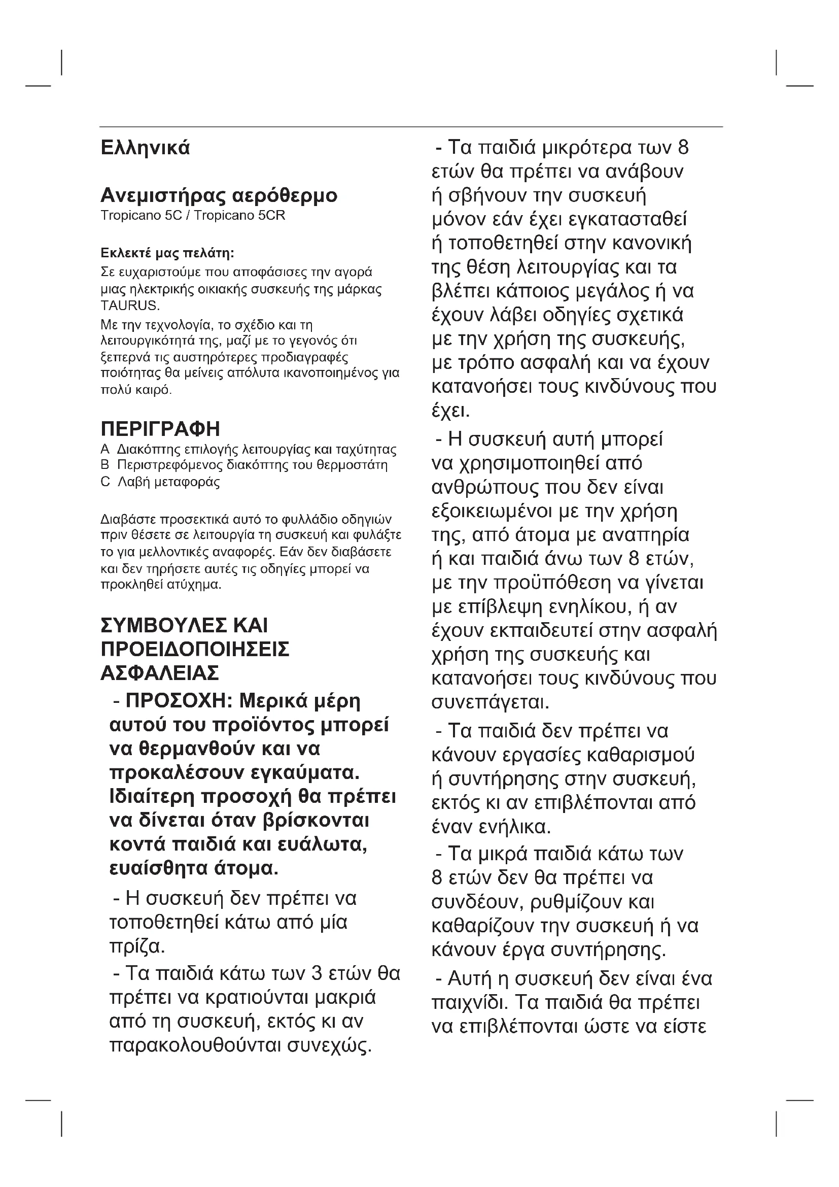 A Διακόπτης επιλογής λειτουργίας και ταχύτητας B Περιστρεφόμενος διακόπτης του θερμοστάτη C Λαβή μεταφοράς Διαβάστε προσεκτικά αυτό το φυλλάδιο οδηγιών πριν θέσετε σε λειτουργία τη συσκευή και φυλάξτε το για μελλοντικές αναφορές. Εάν δεν διαβάσετε και δεν τηρήσετε αυτές τις οδηγίες μπορεί να προκληθεί ατύχημα. ΣΥΜΒΟΥΛΕΣ ΚΑΙ ΠΡΟΕΙΔΟΠΟΙΉΣΕΙΣ