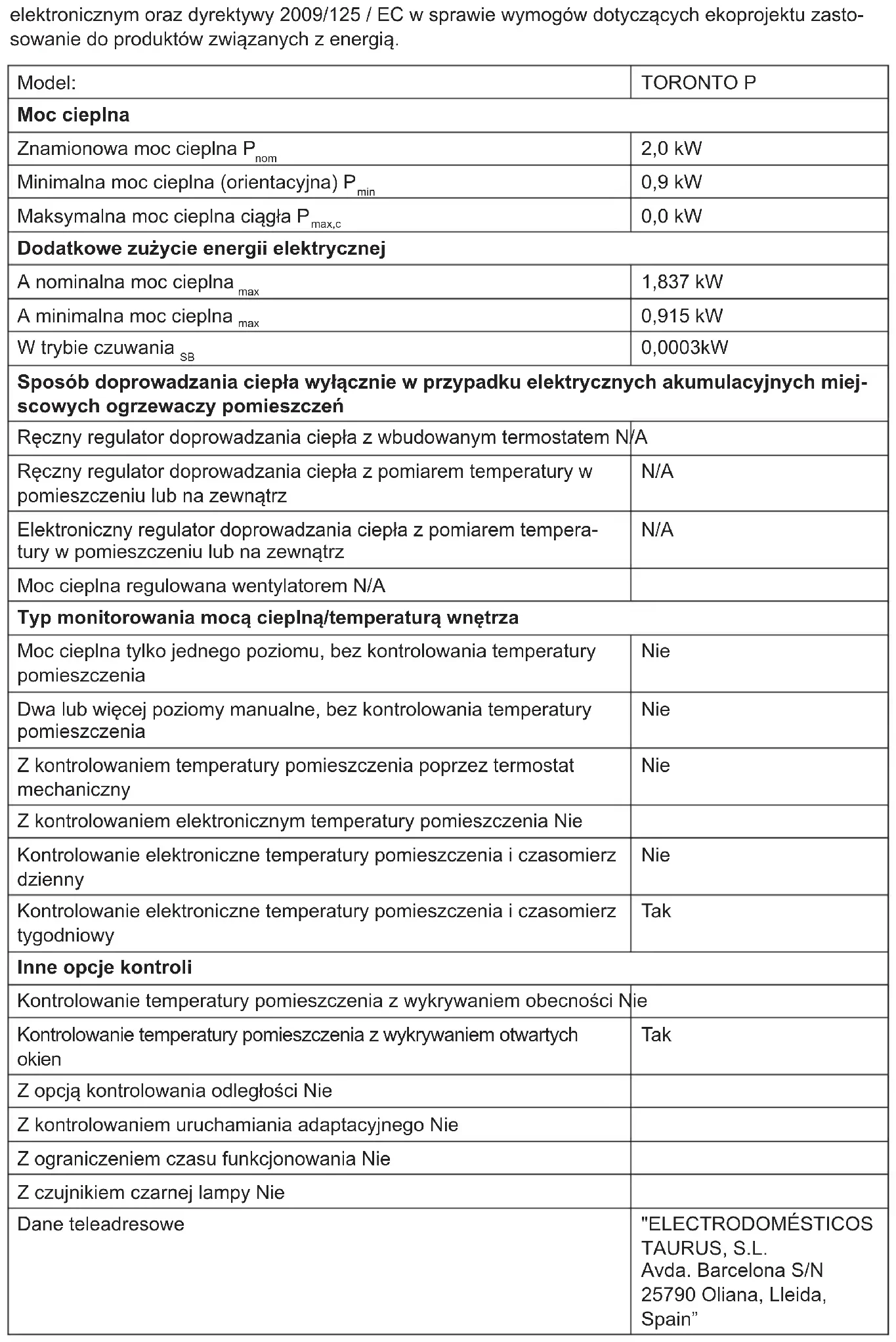 - Τα υλικά που απαρτίζουν τη συσκευασία αυτής της συσκευής, συμμετέχουν σε πρόγραμμα αποκομιδής, ταξινόμησης και ανακύκλωση τους. Αν θέλετε να απαλλαγείτε από αυτά τα υλικά, μπορείτε να χρησιμοποιήσετε τους δημόσιους κάδους που ενδείκνυνται για κάθε είδος υλικού. - Το προϊόν δεν περιέχει συγκεντρώσεις ουσιών που μπορούν να θεωρηθούν επιζήμιες για το περιβάλλον. Αυτό το σύμβολο σημαίνει ότι εάν θέλετε να απαλλαγείτε από το προϊόν, όταν έχει ολοκληρωθεί ο κύκλος ζωής του, οφείλετε να το εναποθέσετε, με τα κατάλληλα μέσα, στα χέρια ενός διαχειριστή αποβλή- των, εγκεκριμένου για την επιλεκτική συλλογή αποβλήτων ειδών ηλεκτρικού και ηλε- κτρονικού εξοπλισμού (ΑΗΗΕ). Αυτή η συσκευή συμμορφώνεται με την Οδηγία 2014/35 / ΕU Οδηγία Χαμηλής Τάσης 2014/30 / ΕU περί ηλεκτρομαγνητικής συμβατότητας με την οδηγία 2011/65 / ΕU σχετικά με τον περιορισμό της χρήσης ορισμένων επικίνδυνων ουσιών σε είδη ηλεκτρικού και ηλεκτρονικού εξοπλισμού και Η οδηγία 2009/125 / ΕC του Συμβουλίου σχετικά με τις απαιτήσεις οικολογικού σχεδιασμού που εφαρμόζονται σε συνδεόμενα με την ενέργεια προϊόντα.Μοντέλο: TORONTO P Θερμική ισχύς Ονομαστική θερμική ισχύς P nom 2,0 kW Ελάχιστη θερμική ισχύς (ενδεικτική) P min 0,9 kW Συνεχής μέγιστη θερμική ισχύς P max,c 0,0 kW Εφεδρική κατανάλωση ηλεκτρικής ενέργειας Σε ονομαστική θερμική ισχύ το max 1,837 kW Σε ελάχιστη θερμική ισχύ το min 0,915 kW Σε κατάσταση αναμονής το