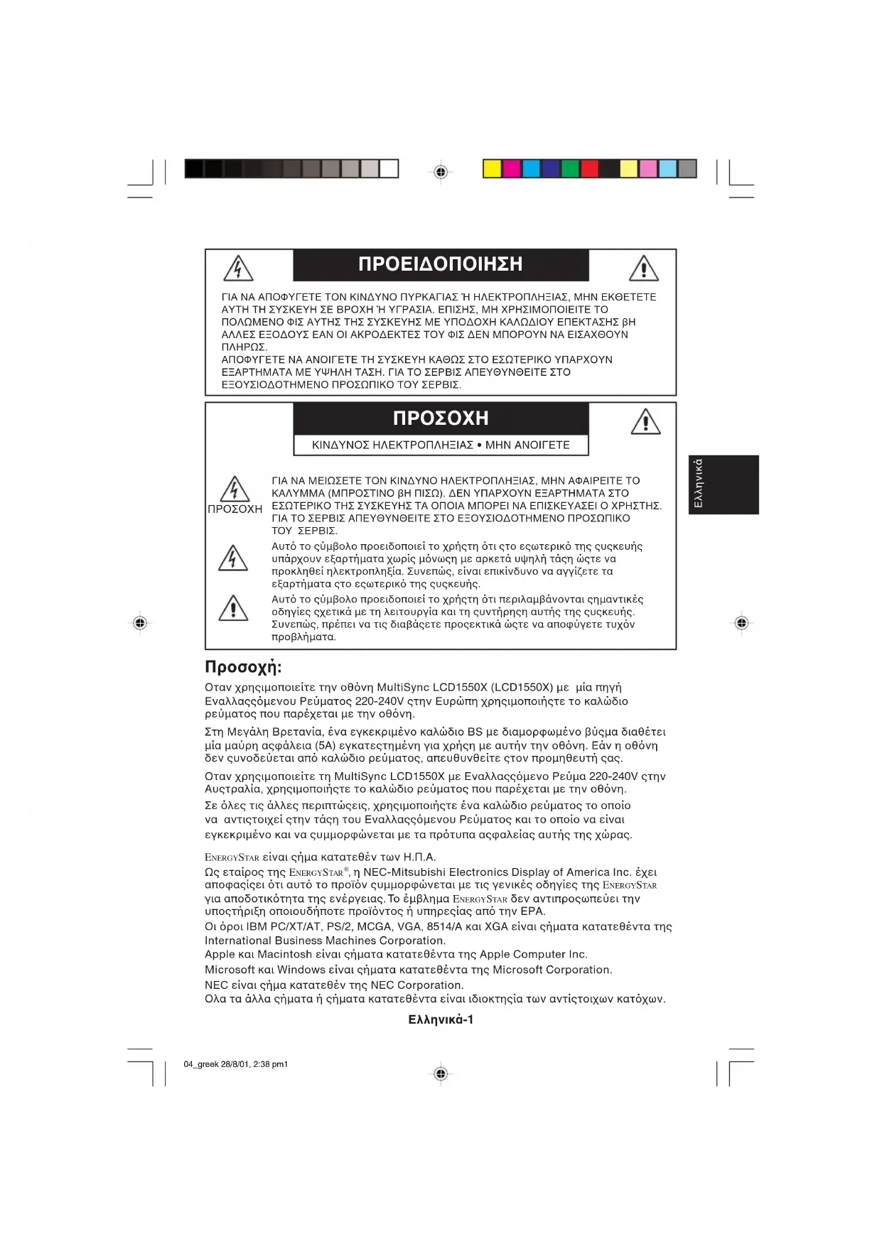 , η NEC-Mitsubishi Electronics Display of America Inc. έχει αποφασίσει τι αυτ το προïν συµµορφώνεται µε τισ γενικέσ οδηγίεσ τησ ENERGYSTAR για αποδοτικτητα τησ ενέργειασ. Το έµβληµα ENERGYSTA R δεν αντιπροσωπεύει την υποστήριξη οποιουδήποτε προïντοσ ή υπηρεσίασ απ την ΕPA. Οι ροι IBM PC/XT/AT, PS/2, MCGA, VGA, 8514/A και XGA είναι σήµατα κατατεθέντα τησ International Business Machines Corporation. Apple και Macintosh είναι σήµατα κατατεθέντα τησ Apple Computer Inc. Microsoft και Windows είναι σήµατα κατατεθέντα τησ Microsoft Corporation. NEC είναι σήµα κατατεθέν τησ NEC Corporation. Ολα τα άλλα σήµατα ή σήµατα κατατεθέντα είναι ιδιοκτησία των αντίστοιχων κατχων. 04_greek 28/8/01, 2:38 pm1Ελληνικά-2