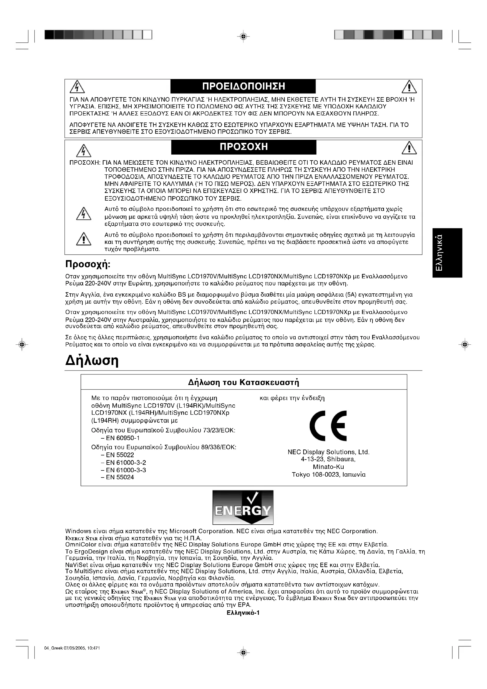 ∆ήλωση του Κατασκευαστή Με το παρν πιστοποιούµε τι η έγχρωµη οθνη MultiSync LCD1970V (L194RK)/MultiSync LCD1970NX (L194RH)/MultiSync LCD1970NXp (L194RH) συµµορφώνεται µε Οδηγία του Ευρωπαϊκού Συµβουλίου 73/23/ΕΟΚ: – EN 60950-1 Οδηγία του Ευρωπαϊκού Συµβουλίου 89/336/ΕΟΚ: – EN 55022 – EN 61000-3-2 – EN 61000-3-3 – EN 55024 και φέρει την ένδειξη NEC Display Solutions, Ltd. 4-13-23, Shibaura, Minato-Ku Tokyo 108-0023, Ιαπωνία Windows είναι σήµα κατατεθέν της Microsoft Corporation. NEC είναι σήµα κατατεθέν της NEC Corporation.