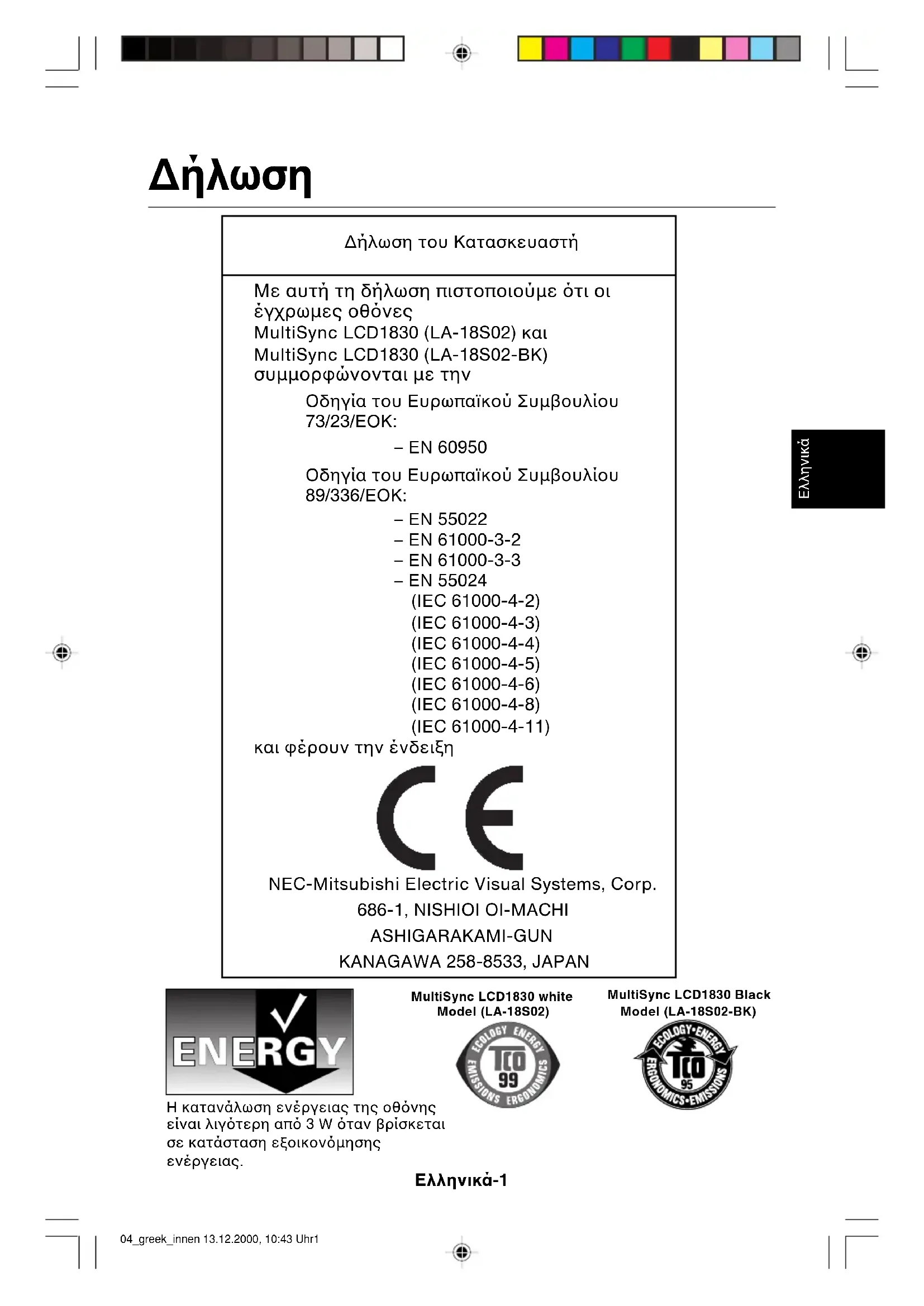 ∆ήλωση του Κατασκευαστή Με αυτή τη δήλωση πιστοποιούµε τι οι έγχρωµες οθνες MultiSync LCD1830 (LA-18S02) και MultiSync LCD1830 (LA-18S02-BK) συµµορφώνονται µε την Οδηγία του Ευρωπαïκού Συµβουλίου 73/23/ΕΟΚ: – EN 60950 Οδηγία του Ευρωπαïκού Συµβουλίου 89/336/ΕΟΚ: – EN 55022 – EN 61000-3-2 – EN 61000-3-3 – EN 55024 (IEC 61000-4-2) (IEC 61000-4-3) (IEC 61000-4-4) (IEC 61000-4-5) (IEC 61000-4-6) (IEC 61000-4-8) (IEC 61000-4-11) και φέρουν την ένδειξη NEC-Mitsubishi Electric Visual Systems, Corp.