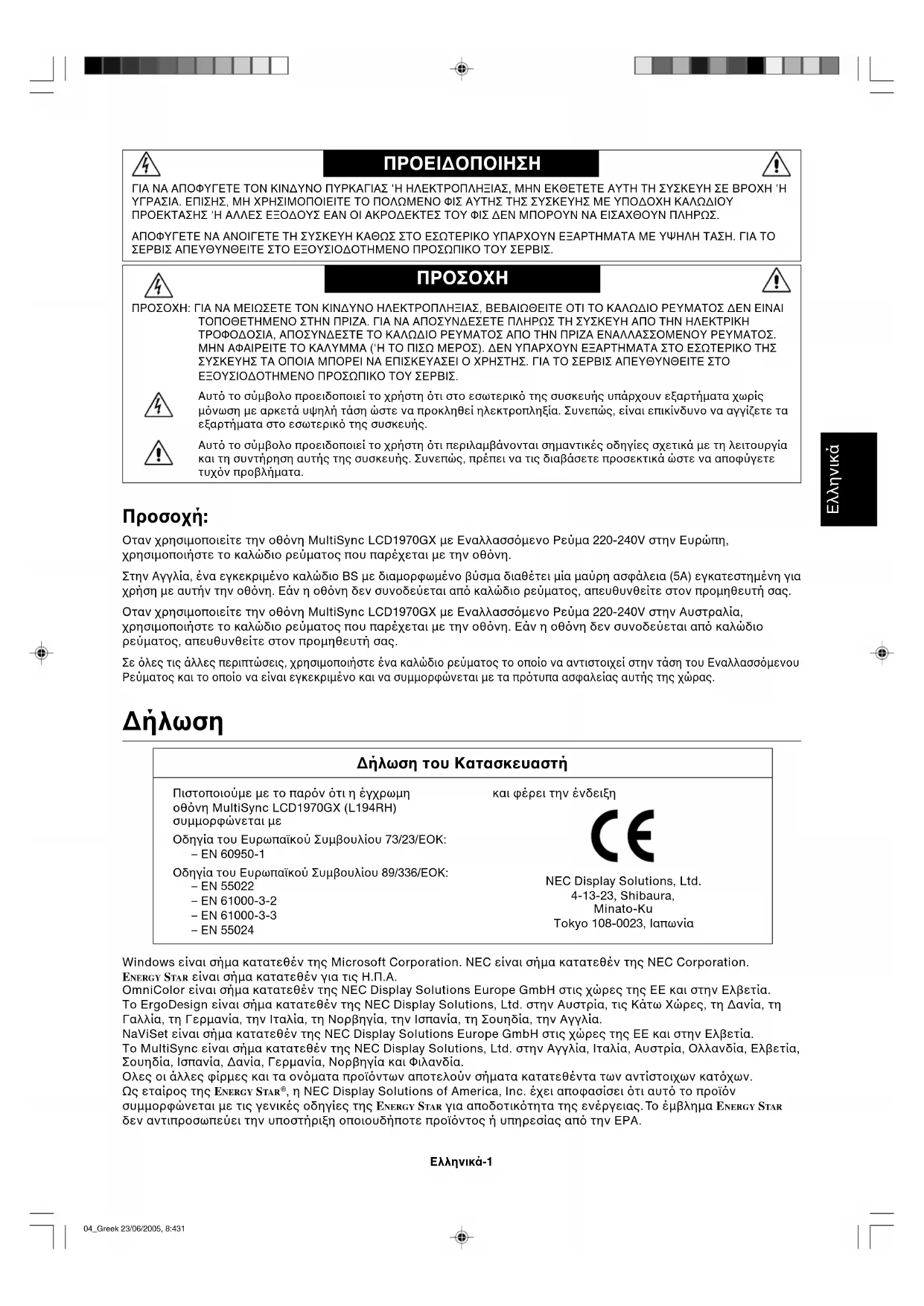 ∆ήλωση του Κατασκευαστή Πιστοποιούµε µε το παρν τι η έγχρωµη οθνη MultiSync LCD1970GX (L194RH) συµµορφώνεται µε Οδηγία του Ευρωπαϊκού Συµβουλίου 73/23/ΕΟΚ: – EN 60950-1 Οδηγία του Ευρωπαϊκού Συµβουλίου 89/336/ΕΟΚ: – EN 55022 – EN 61000-3-2 – EN 61000-3-3 – EN 55024 και φέρει την ένδειξη NEC Display Solutions, Ltd. 4-13-23, Shibaura, Minato-Ku Tokyo 108-0023, Ιαπωνία Windows είναι σήµα κατατεθέν της Microsoft Corporation. NEC είναι σήµα κατατεθέν της NEC Corporation. ENERGY STAR είναι σήµα κατατεθέν για τις Η.Π.Α. OmniColor είναι σήµα κατατεθέν της NEC Display Solutions Europe GmbH στις χώρες της ΕΕ και στην Ελβετία. Το ΕrgoDesign είναι σήµα κατατεθέν της NEC Display Solutions, Ltd. στην Αυστρία, τις Κάτω Χώρες, τη ∆ανία, τη Γαλλία, τη Γερµανία, την Ιταλία, τη Νορβηγία, την Ισπανία, τη Σουηδία, την Αγγλία. NaViSet είναι σήµα κατατεθέν της NEC Display Solutions Europe GmbH στις χώρες της ΕΕ και στην Ελβετία. Το MultiSync είναι σήµα κατατεθέν της NEC Display Solutions, Ltd. στην Αγγλία, Ιταλία, Αυστρία, Ολλανδία, Ελβετία, Σουηδία, Ισπανία, ∆ανία, Γερµανία, Νορβηγία και Φιλανδία. Ολες οι άλλες φίρµες και τα ονµατα προϊντων αποτελούν σήµατα κατατεθέντα των αντίστοιχων κατχων. Ως εταίρος της ENERGY STA R