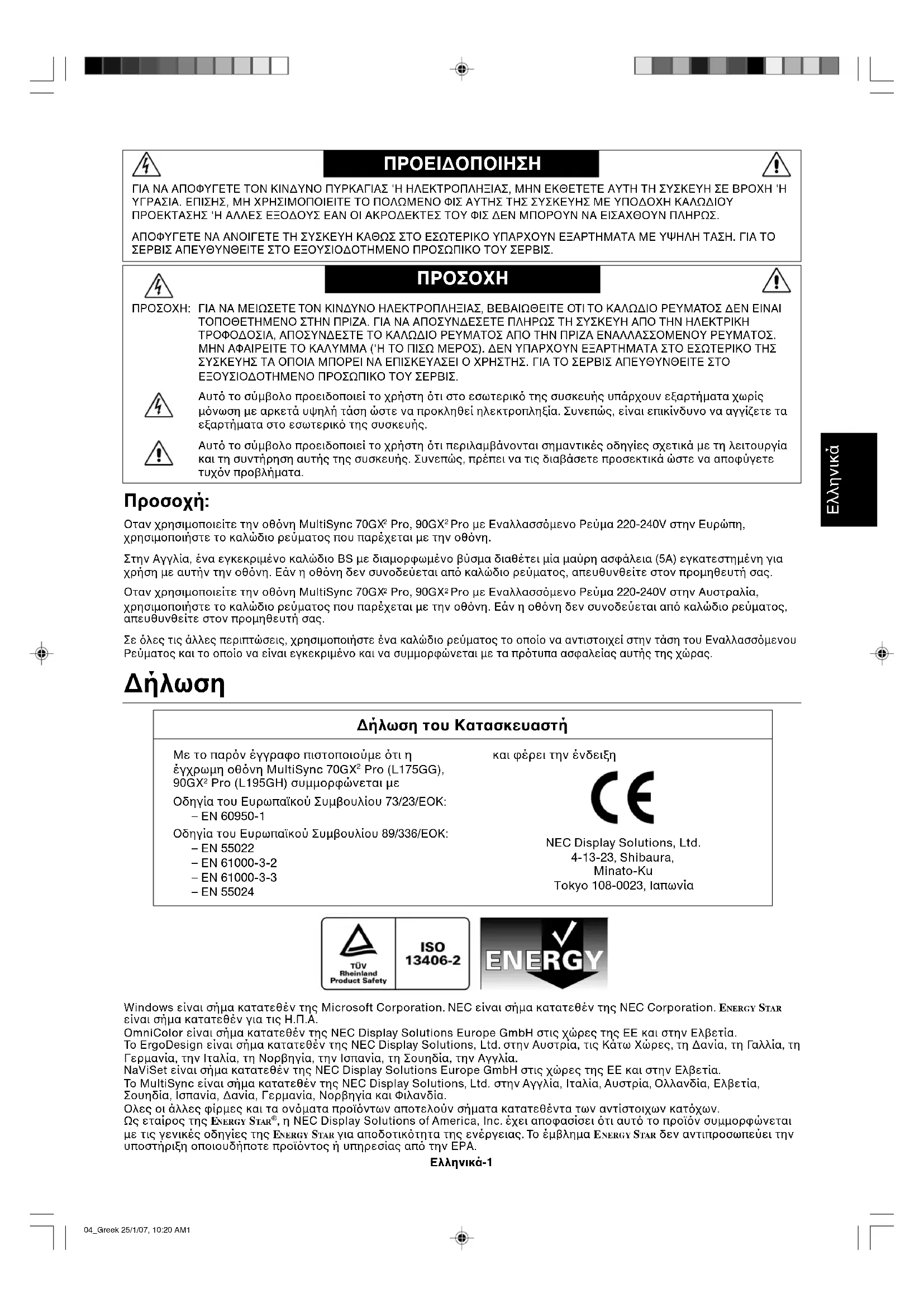 Pro (L195GH) συµµορφώνεται µε Οδηγία του Ευρωπαϊκού Συµβουλίου 73/23/ΕΟΚ: – EN 60950-1 Οδηγία του Ευρωπαϊκού Συµβουλίου 89/336/ΕΟΚ: – EN 55022 – EN 61000-3-2 – EN 61000-3-3 – EN 55024 και φέρει την ένδειξη NEC Display Solutions, Ltd. 4-13-23, Shibaura, Minato-Ku Tokyo 108-0023, Ιαπωνία Windows είναι σήµα κατατεθέν της Microsoft Corporation. NEC είναι σήµα κατατεθέν της NEC Corporation. ENERGY STAR είναι σήµα κατατεθέν για τις Η.Π.Α. OmniColor είναι σήµα κατατεθέν της NEC Display Solutions Europe GmbH στις χώρες της ΕΕ και στην Ελβετία. Το ΕrgoDesign είναι σήµα κατατεθέν της NEC Display Solutions, Ltd. στην Αυστρία, τις Κάτω Χώρες, τη ∆ανία, τη Γαλλία, τη Γερµανία, την Ιταλία, τη Νορβηγία, την Ισπανία, τη Σουηδία, την Αγγλία. NaViSet είναι σήµα κατατεθέν της NEC Display Solutions Europe GmbH στις χώρες της ΕΕ και στην Ελβετία. Το MultiSync είναι σήµα κατατεθέν της NEC Display Solutions, Ltd. στην Αγγλία, Ιταλία, Αυστρία, Ολλανδία, Ελβετία, Σουηδία, Ισπανία, ∆ανία, Γερµανία, Νορβηγία και Φιλανδία. Ολες οι άλλες φίρµες και τα ονµατα προϊντων αποτελούν σήµατα κατατεθέντα των αντίστοιχων κατχων. Ως εταίρος της E NERGY STAR