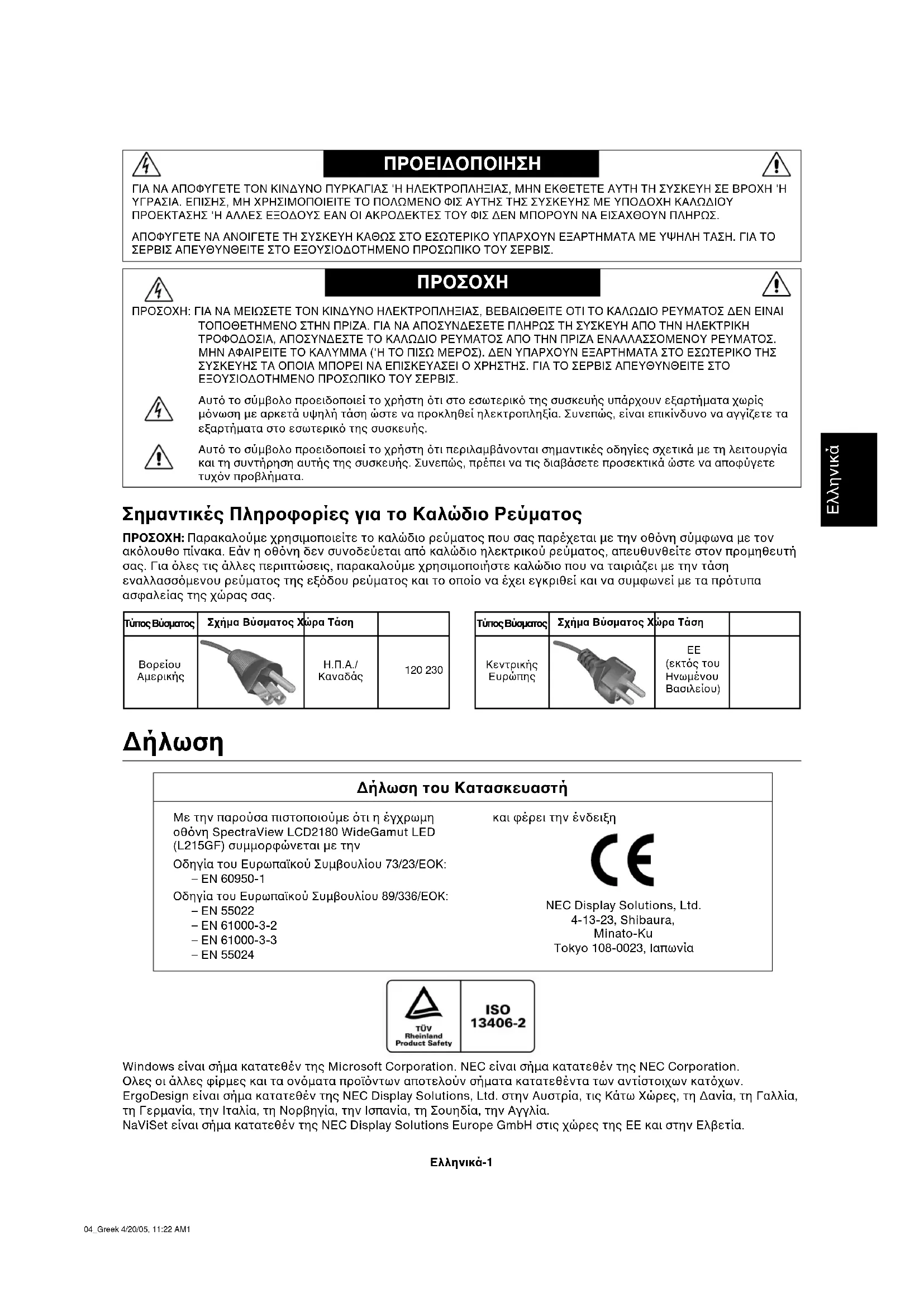 ∆ήλωση του Κατασκευαστή Με την παρούσα πιστοποιούµε τι η έγχρωµη οθνη SpectraView LCD2180 WideGamut LED (L215GF) συµµορφώνεται µε την Οδηγία του Ευρωπαϊκού Συµβουλίου 73/23/ΕΟΚ: – EN 60950-1 Οδηγία του Ευρωπαϊκού Συµβουλίου 89/336/ΕΟΚ: – EN 55022 – EN 61000-3-2 – EN 61000-3-3 – EN 55024 και φέρει την ένδειξη NEC Display Solutions, Ltd. 4-13-23, Shibaura, Minato-Ku Tokyo 108-0023, Ιαπωνία Windows είναι σήµα κατατεθέν της Microsoft Corporation. NEC είναι σήµα κατατεθέν της NEC Corporation. Ολες οι άλλες φίρµες και τα ονµατα προϊντων αποτελούν σήµατα κατατεθέντα των αντίστοιχων κατχων. ErgoDesign είναι σήµα κατατεθέν της NEC Display Solutions, Ltd. στην Αυστρία, τις Κάτω Χώρες, τη ∆ανία, τη Γαλλία, τη Γερµανία, την Ιταλία, τη Νορβηγία, την Ισπανία, τη Σουηδία, την Αγγλία. NaViSet είναι σήµα κατατεθέν της NEC Display Solutions Europe GmbH στις χώρες της ΕΕ και στην Ελβετία. Σηµαντικές Πληροφορίες για το Καλώδιο Ρεύµατος ΠΡΟΣΟΧΗ: Παρακαλούµε χρησιµοποιείτε το καλώδιο ρεύµατος που σας παρέχεται µε την οθνη σύµφωνα µε τον ακλουθο πίνακα. Εάν η οθνη δεν συνοδεύεται απ καλώδιο ηλεκτρικού ρεύµατος, απευθυνθείτε στον προµηθευτή σας. Για λες τις άλλες περιπτώσεις, παρακαλούµε χρησιµοποιήστε καλώδιο που να ταιριάζει µε την τάση εναλλασσµενου ρεύµατος της εξδου ρεύµατος και το οποίο να έχει εγκριθεί και να συµφωνεί µε τα πρτυπα ασφαλείας της χώρας σας. Τύπος ΒύσµατοςΚεντρικήςΕυρώπηςΒορείουΑµερικήςΣχήµα Βύσµατος Χώρα Τάση120 230Η.Π.Α./Καναδάς (εκτς τουΗνωµένουΒασιλείου)Τύπος ΒύσµατοςΣχήµα Βύσµατος Χώρα Τάση04_Greek 4/20/05, 11:22 AM1Ελληνικά-2