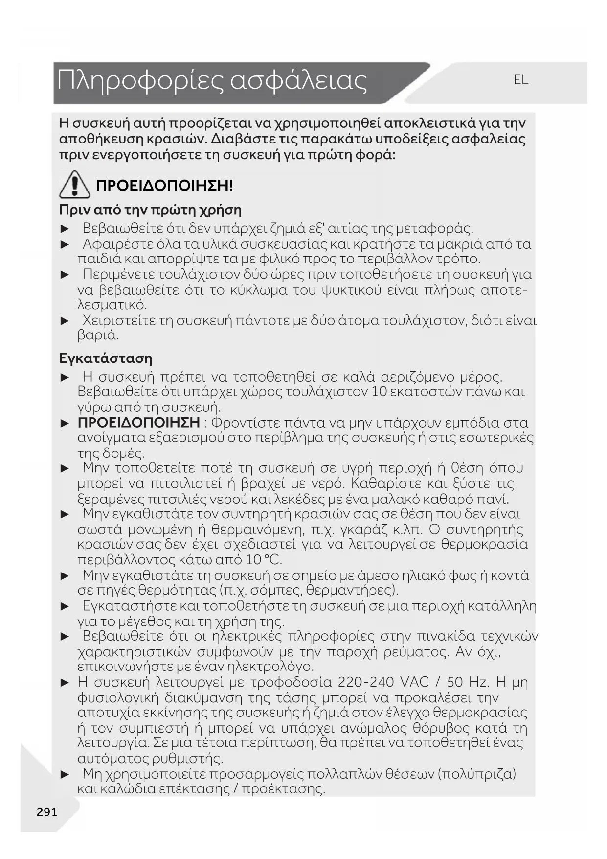► Μην τοποθετείτε ποτέ τη συσκευή σε υγρή περιοχή ή θέση όπου μπορεί να πιτσιλιστεί ή βραχεί με νερό. Καθαρίστε και ξύστε τις ξεραμένες πιτσιλιές νερού και λεκέδες με ένα μαλακό καθαρό πανί. ► Μην εγκαθιστάτε τον συντηρητή κρασιών σας σε θέση που δεν είναι σωστά μονωμένη ή θερμαινόμενη, π.χ. γκαράζ κ.λπ. Ο συντηρητής κρασιών σας δεν έχει σχεδιαστεί για να λειτουργεί σε θερμοκρασία περιβάλλοντος κάτω από 10 °C. ► Μην εγκαθιστάτε τη συσκευή σε σημείο με άμεσο ηλιακό φως ή κοντά σε πηγές θερμότητας (π.χ. σόμπες, θερμαντήρες). ► Εγκαταστήστε και τοποθετήστε τη συσκευή σε μια περιοχή κατάλληλη για το μέγεθος και τη χρήση της. ► Βεβαιωθείτε ότι οι ηλεκτρικές πληροφορίες στην πινακίδα τεχνικών χαρακτηριστικών συμφωνούν με την παροχή ρεύματος. Αν όχι, επικοινωνήστε με έναν ηλεκτρολόγο. ► Η συσκευή λειτουργεί με τροφοδοσία 220-240 VAC / 50 Hz. Η μη φυσιολογική διακύμανση της τάσης μπορεί να προκαλέσει την αποτυχία εκκίνησης της συσκευής ή ζημιά στον έλεγχο θερμοκρασίας ή τον συμπιεστή ή μπορεί να υπάρχει ανώμαλος θόρυβος κατά τη λειτουργία. Σε μια τέτοια περίπτωση, θα πρέπει να τοποθετηθεί ένας αυτόματος ρυθμιστής. ► Μη χρησιμοποιείτε προσαρμογείς πολλαπλών θέσεων (πολύπριζα) και καλώδια επέκτασης / προέκτασης. 291EL Πληροφορίες ασφάλειας "92 ΠΡΟΕΙΔΟΠΟΙΗΣΗ! ► ΠΡΟΕΙΔΟΠΟΙΗΣΗ: Μην τοποθετείτε πολλαπλές φορητές πρίζες ή φορητά τροφοδοτικά στο πίσω μέρος της συσκευής. ► ΠΡΟΕΙΔΟΠΟΙΗΣΗ: Κατά την τοποθέτηση της συσκευής διασφαλίστε ότι το καλώδιο τροφοδοσίας δεν έχει παγιδευτεί ή υποστεί ζημιά. ► Μην πατάτε το καλώδιο τροφοδοσίας.► Χρησιμοποιήστε μια ξεχωριστή γειωμένη πρίζα για την παροχή ηλεκτρικού ρεύματος, η οποία να είναι εύκολα προσβάσιμη. Αυτή η συσκευή πρέπει να είναι γειωμένη. ► Μόνο για το Ηνωμένο Βασίλειο: Το καλώδιο τροφοδοσίας της συσκευής είναι εξοπλισμένο με βύσμα 3-καλωδίων (με γείωση) που ταιριάζει σε μια τυπική πρίζα 3-καλωδίων (πρίζα με γείωση). Ποτέ μην κόβετε ή αποσυναρμολογείτε τον τρίτο πείρο (γείωση). Μετά την εγκα- τάσταση της συσκευής, το βύσμα πρέπει να είναι άμεσα προσβάσιμο. ► ΠΡΟΕΙΔΟΠΟΙΗΣΗ: Αποφύγετε την πρόκληση ζημιών στο κύκλωμα