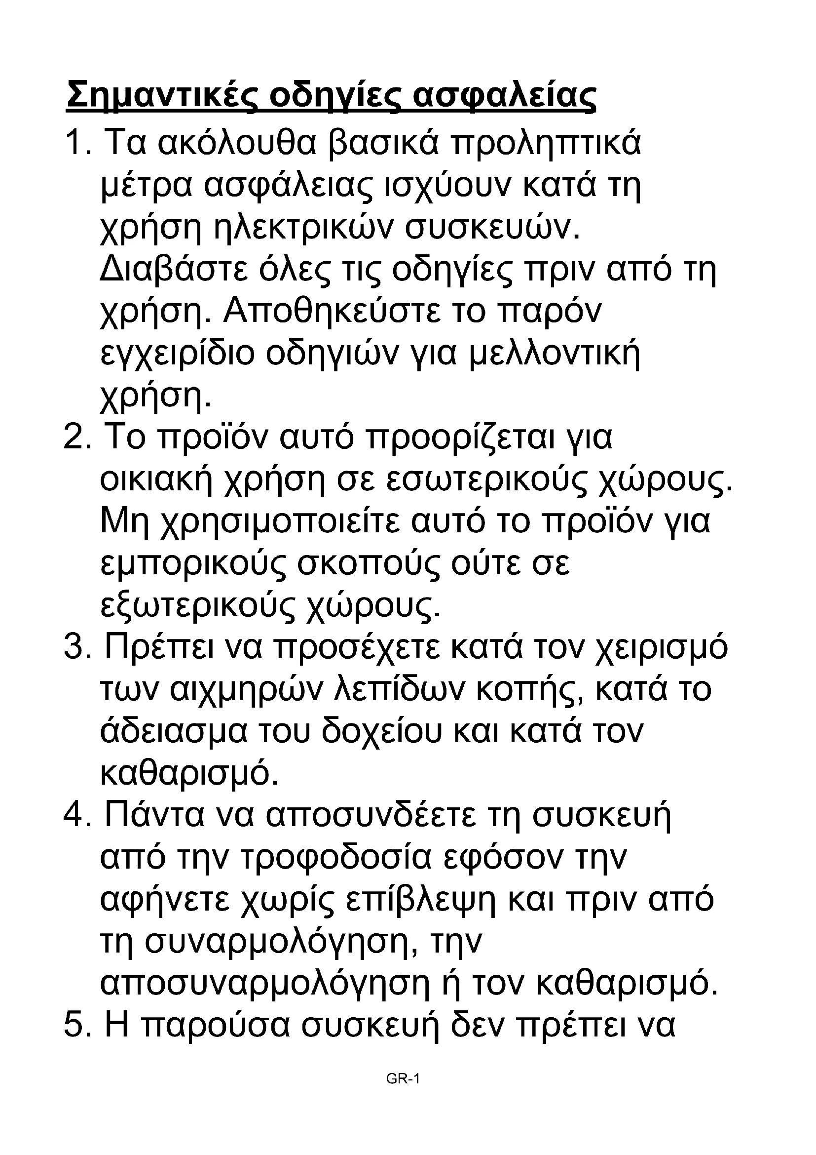 μέτρα ασφάλειας ισχύουν κατά τη χρήση ηλεκτρικών συσκευών. Διαβάστε όλες τις οδηγίες πριν από τη χρήση. Αποθηκεύστε το παρόν εγχειρίδιο οδηγιών για μελλοντική