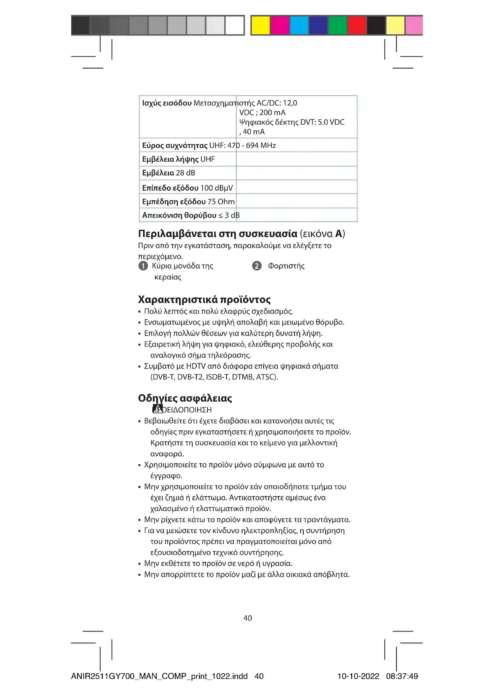 Αριθμός είδους ANIR2511GY700 ANIR2511GY700_MAN_COMP_print_1022.indd 39ANIR2511GY700_MAN_COMP_print_1022.indd 39 10-10-2022 08:37:4910-10-2022 08:37:4940 Ισχύς εισόδου Μετασχηματιστής AC/DC: 12,0 VDC ; 200 mA Ψηφιακός δέκτης DVT: 5.0 VDC , 40 mA Εύρος συχνότητας UHF: 470 - 694 MHz Εμβέλεια λήψης UHF Εμβέλεια 28 dB Επίπεδο εξόδου 100 dBµV Εµπέδηση εξόδου 75 Ohm Απεικόνιση θορύβου ≤ 3 dB Περιλαμβάνεται στη συσκευασία (εικόνα A) Πριν από την εγκατάσταση, παρακαλούμε να ελέγξετε το περιεχόμενο. 1 Κύρια μονάδα της