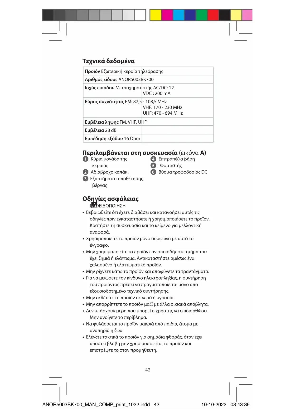 ANOR5003BK700 Προοριζόμενη χρήση Η κεραία αυτή είναι ειδικά σχεδιασμένη για λήψη επίγειας ψηφιακής εκπομπής τηλεόρασης. Το προϊόν είναι μια κεραία που μπορεί να χρησιμοποιηθεί με τηλεόραση ή ένα ψηφιακό δέκτη που υποστηρίζει ομοαξονικό καλώδιο ισχύος. Το προϊόν αυτό προορίζεται αποκλειστικά για χρήση σε εξωτερικό χώρο. ANOR5003BK700_MAN_COMP_print_1022.indd 41ANOR5003BK700_MAN_COMP_print_1022.indd 41 10-10-2022 08:43:3910-10-2022 08:43:3942 Τεχνικά δεδομένα Προϊόν Εξωτερική κεραία τηλεόρασης Αριθμός είδους ANOR5003BK700 Ισχύς εισόδου Μετασχηματιστής AC/DC: 12 VDC ; 200 mA Εύρος συχνότητας FM: 87,5 - 108,5 MHz VHF: 170 - 230 MHz UHF: 470 - 694 MHz Εμβέλεια λήψης FM, VHF, UHF Εμβέλεια 28 dB Εµπέδηση εξόδου 16 Ohm Περιλαμβάνεται στη συσκευασία (εικόνα A) 1 Κύρια μονάδα της