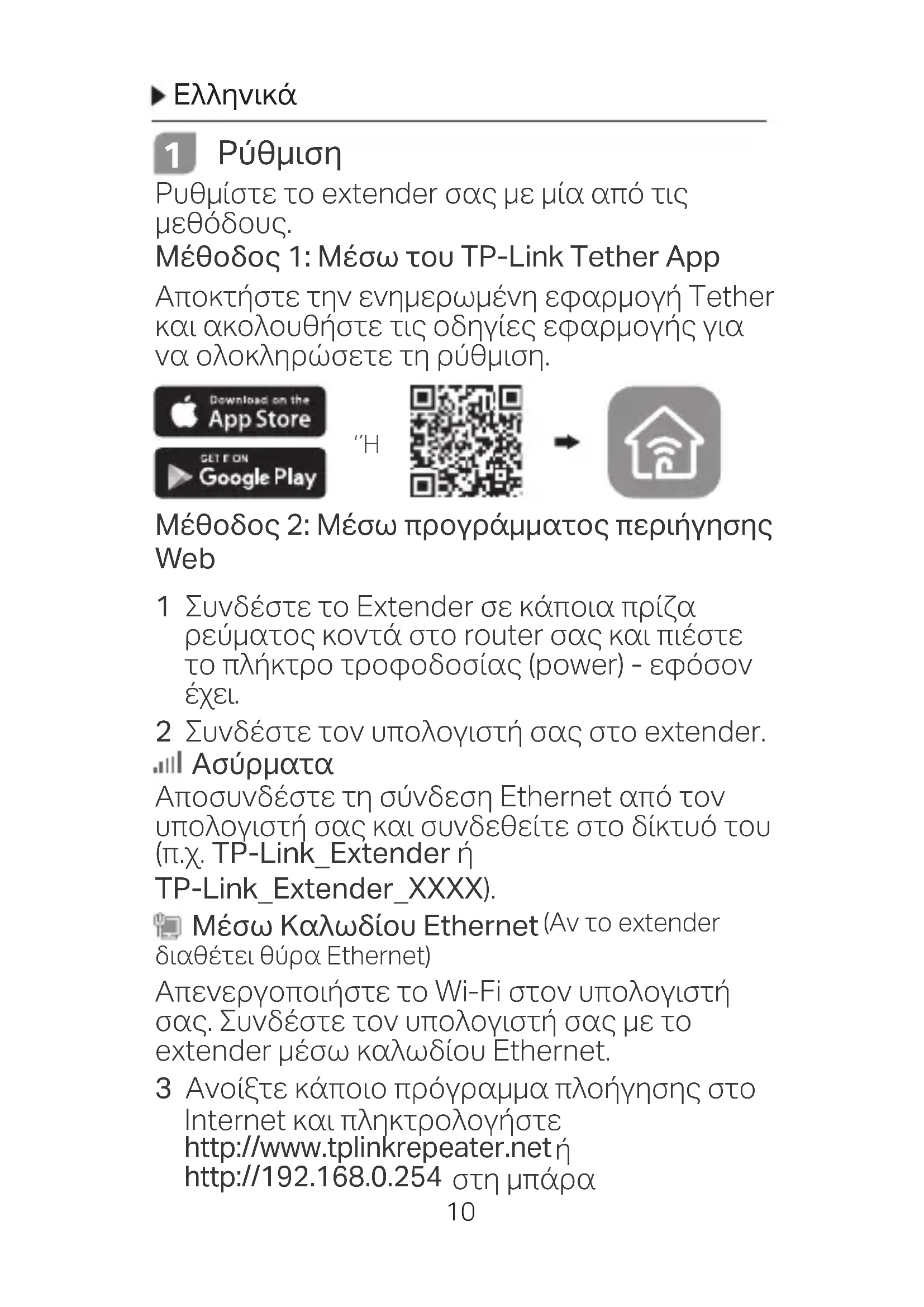 Μέθοδος 1: Μέσω του TP-Link Tether App Αποκτήστε την ενημερωμένη εφαρμογή Tether και ακολουθήστε τις οδηγίες εφαρμογής για να ολοκληρώσετε τη ρύθμιση. Μέθοδος 2: Μέσω προγράμματος περιήγησης Web 1 Συνδέστε το Extender σε κάποια πρίζα ρεύματος κοντά στο router σας και πιέστε το πλήκτρο τροφοδοσίας (power) - εφόσον