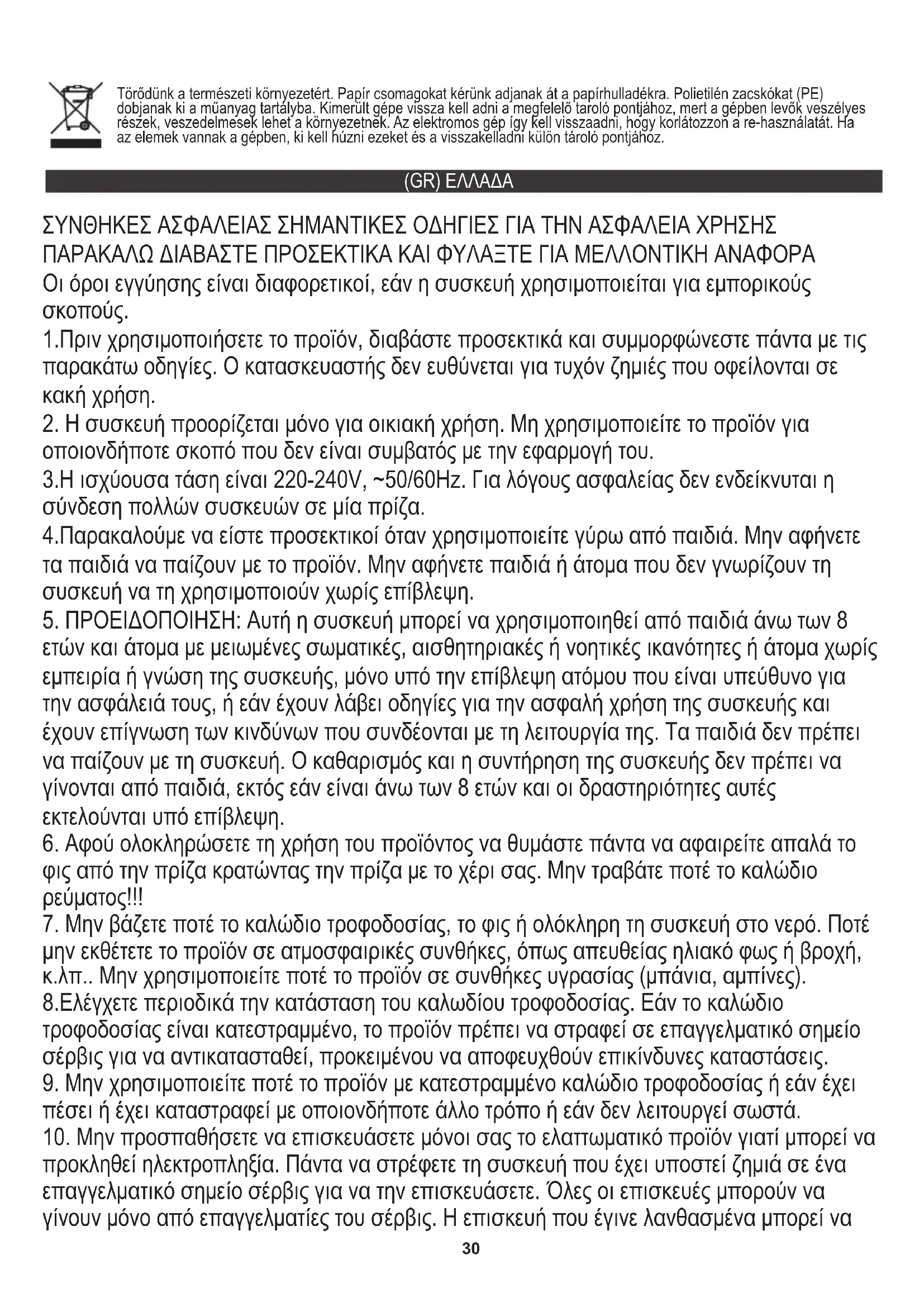 ετών και άτομα με μειωμένες σωματικές, αισθητηριακές ή νοητικές ικανότητες ή άτομα χωρίς εμπειρία ή γνώση της συσκευής, μόνο υπό την επίβλεψη ατόμου που είναι υπεύθυνο για την ασφάλειά τους, ή εάν έχουν λάβει οδηγίες για την ασφαλή χρήση της συσκευής και έχουν επίγνωση των κινδύνων που συνδέονται με τη λειτουργία της. Τα παιδιά δεν πρέπει να παίζουν με τη συσκευή. Ο καθαρισμός και η συντήρηση της συσκευής δεν πρέπει να γίνονται από παιδιά, εκτός εάν είναι άνω των 8 ετών και οι δραστηριότητες αυτές εκτελούνται υπό επίβλεψη. (GR) ΕΛΛΑΔΑ Törődünk a természeti környezetért. Papír csomagokat kérünk adjanak át a papírhulladékra. Polietilén zacskókat (PE) dobjanak ki a műanyag tartályba. Kimerült gépe vissza kell adni a megfelelő taroló pontjához, mert a gépben levők veszélyes részek, veszedelmesek lehet a környezetnek. Az elektromos gép így kell visszaadni, hogy korlátozzon a re-használatát. Ha az elemek vannak a gépben, ki kell húzni ezeket és a visszakelladni külön tároló pontjához.31