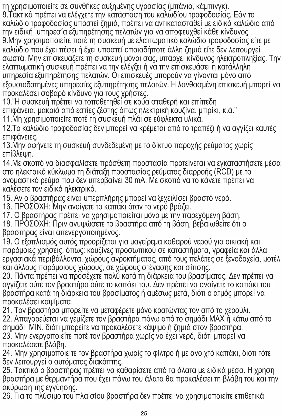 24. Μην χρησιμοποιείτε τον βραστήρα χωρίς το φίλτρο ή με ανοιχτό καπάκι, διότι τότε