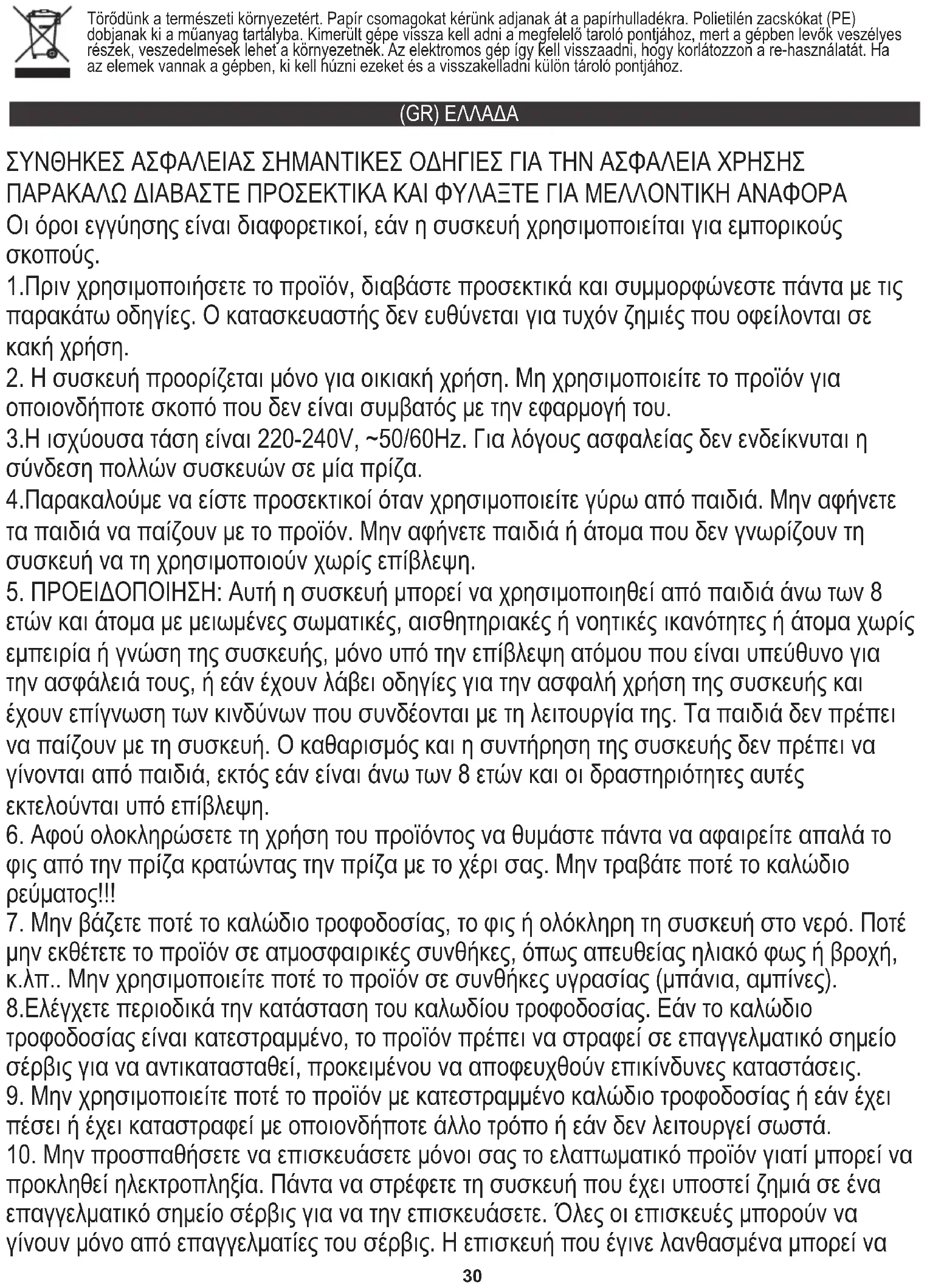 ετών και άτομα με μειωμένες σωματικές, αισθητηριακές ή νοητικές ικανότητες ή άτομα χωρίς εμπειρία ή γνώση της συσκευής, μόνο υπό την επίβλεψη ατόμου που είναι υπεύθυνο για την ασφάλειά τους, ή εάν έχουν λάβει οδηγίες για την ασφαλή χρήση της συσκευής και έχουν επίγνωση των κινδύνων που συνδέονται με τη λειτουργία της. Τα παιδιά δεν πρέπει να παίζουν με τη συσκευή. Ο καθαρισμός και η συντήρηση της συσκευής δεν πρέπει να γίνονται από παιδιά, εκτός εάν είναι άνω των 8 ετών και οι δραστηριότητες αυτές εκτελούνται υπό επίβλεψη. (GR) ΕΛΛΑΔΑ Törődünk a természeti környezetért. Papír csomagokat kérünk adjanak át a papírhulladékra. Polietilén zacskókat (PE) dobjanak ki a műanyag tartályba. Kimerült gépe vissza kell adni a megfelelő taroló pontjához, mert a gépben levők veszélyes részek, veszedelmesek lehet a környezetnek. Az elektromos gép így kell visszaadni, hogy korlátozzon a re-használatát. Ha az elemek vannak a gépben, ki kell húzni ezeket és a visszakelladni külön tároló pontjához.31